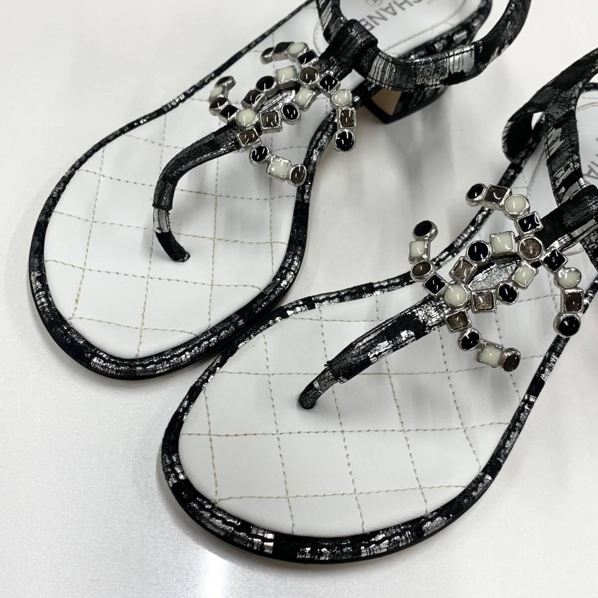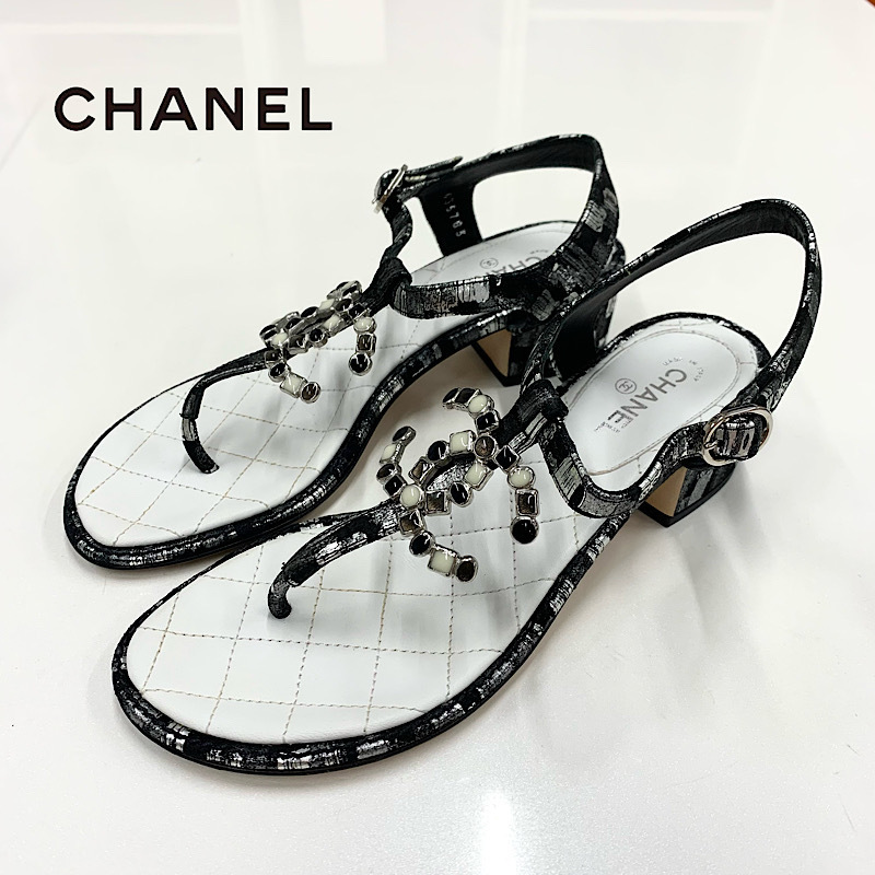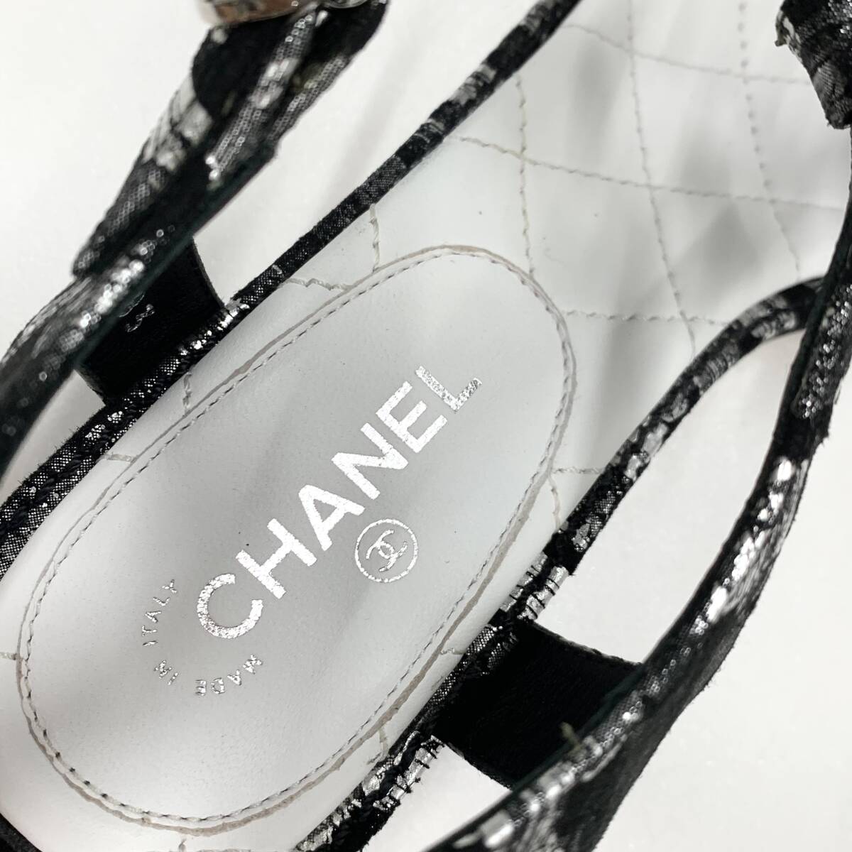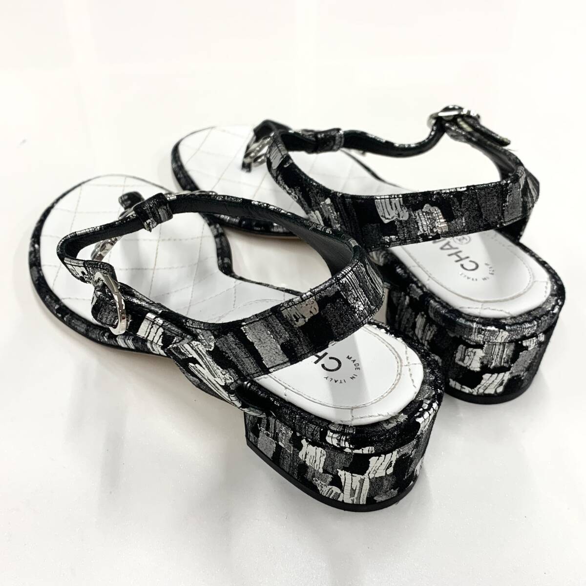 シャネル ファブリック レザー ココマーク トングサンダル ブラック シルバー