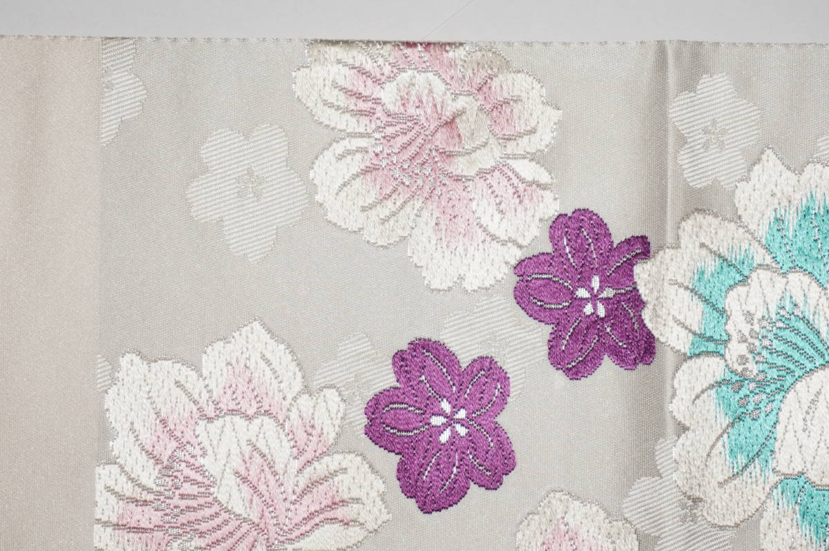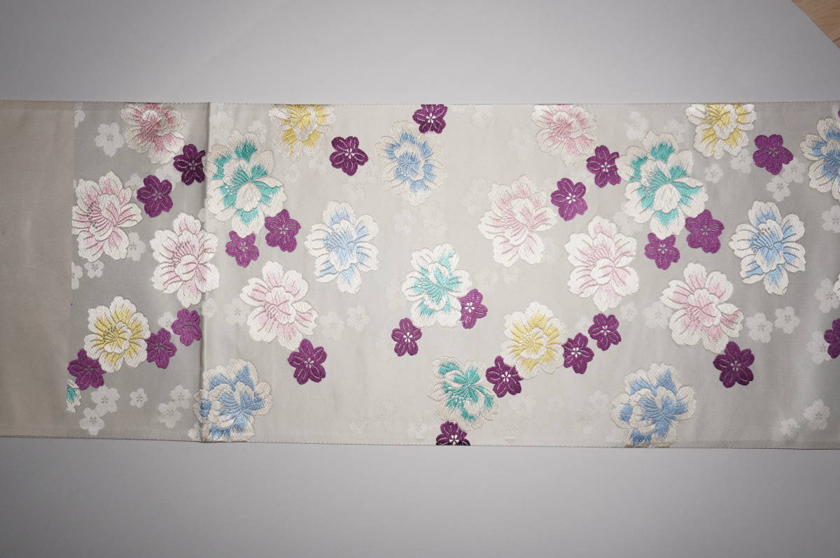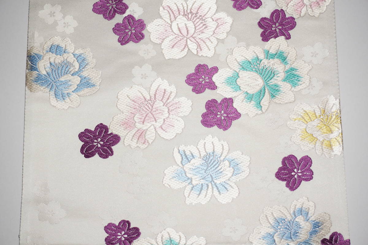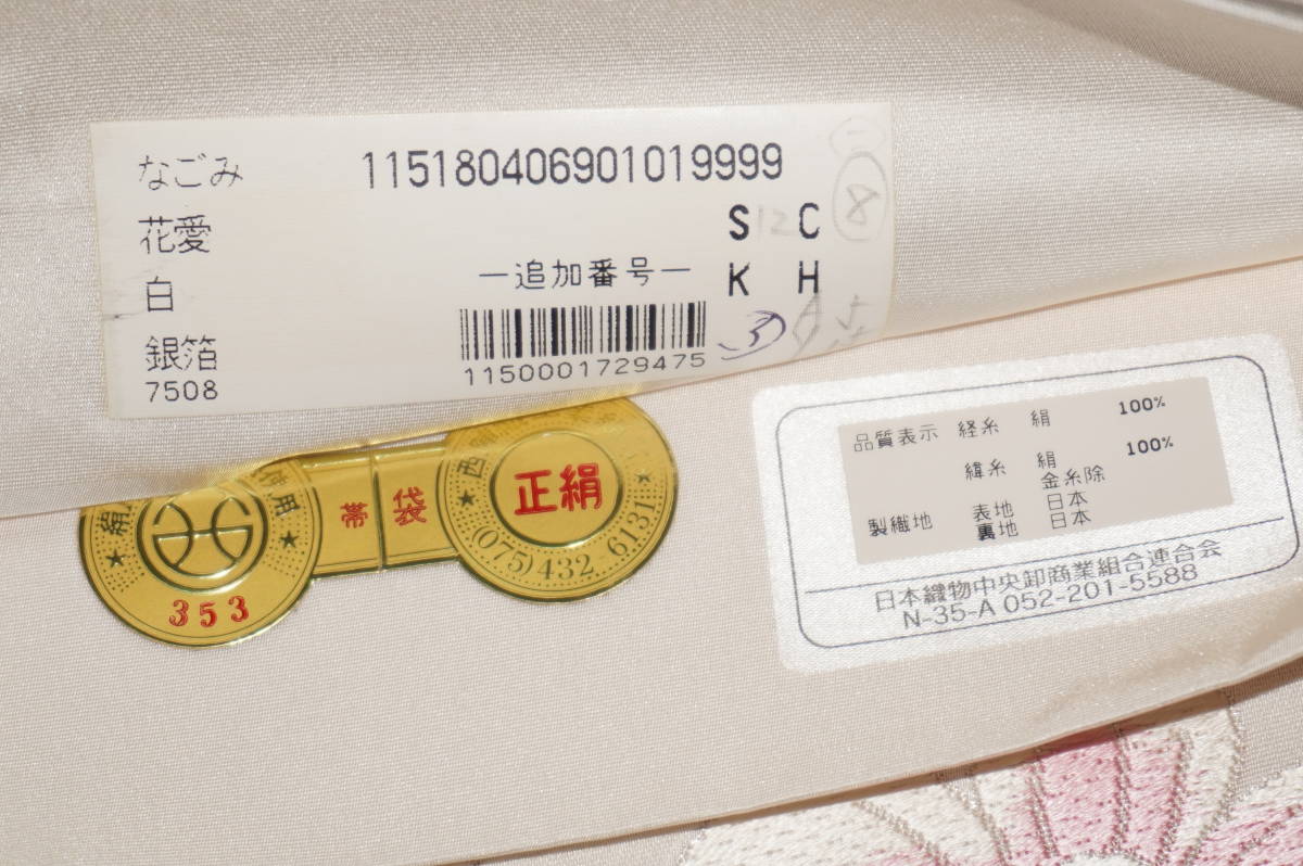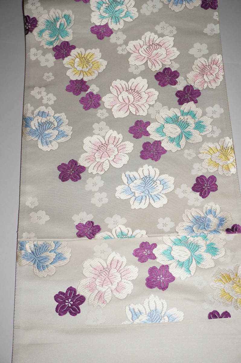 なお、帯柄左上に無地で出ているところは裏無地で、柄と柄の間に出ているところは手先と前太鼓のあいだの無地部分です。六通柄です。金銀糸が多用されているためストロボの照りで、しろぽく写っている部分があります。