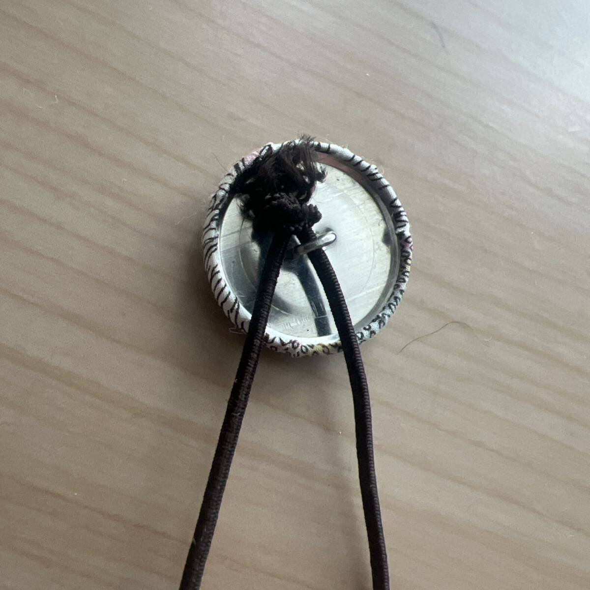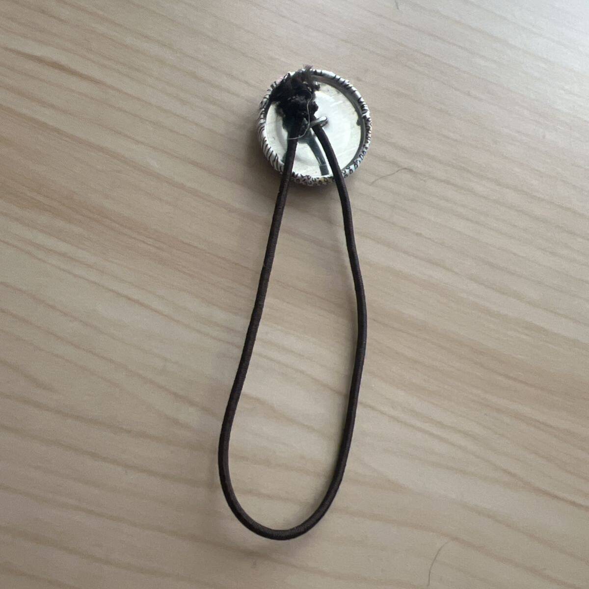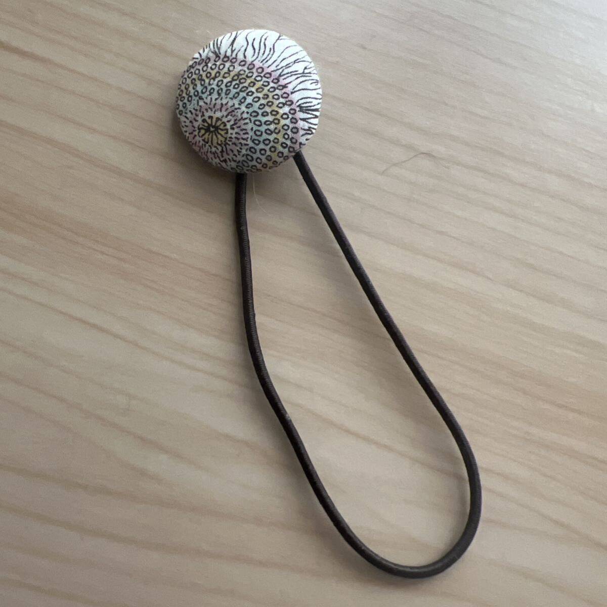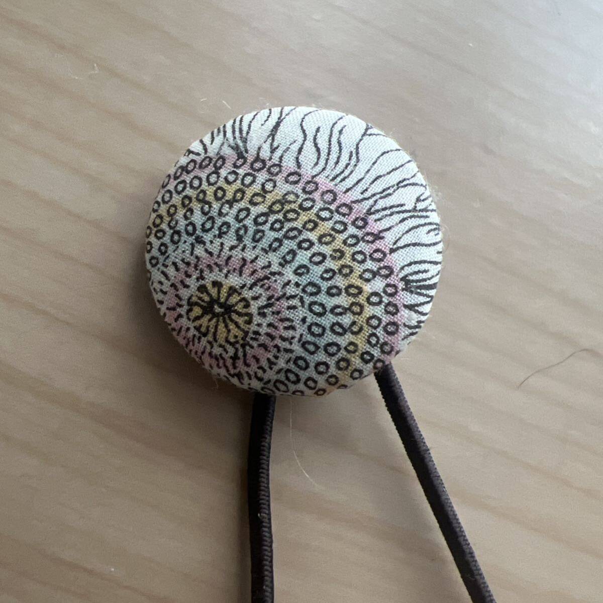 とても素敵な色合いの花プリントで、何か金属に布でくるんだボタンを1個使ったヘアゴムです。