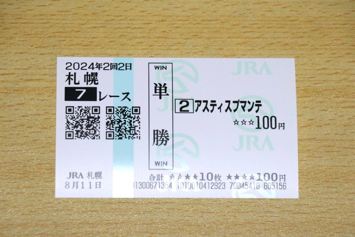 アスティスプマンテ 札幌7R (2024年8/11) 現地単勝馬券(札幌競馬場)です。気に入って頂けた方の落札を心よりお待ちしております。
