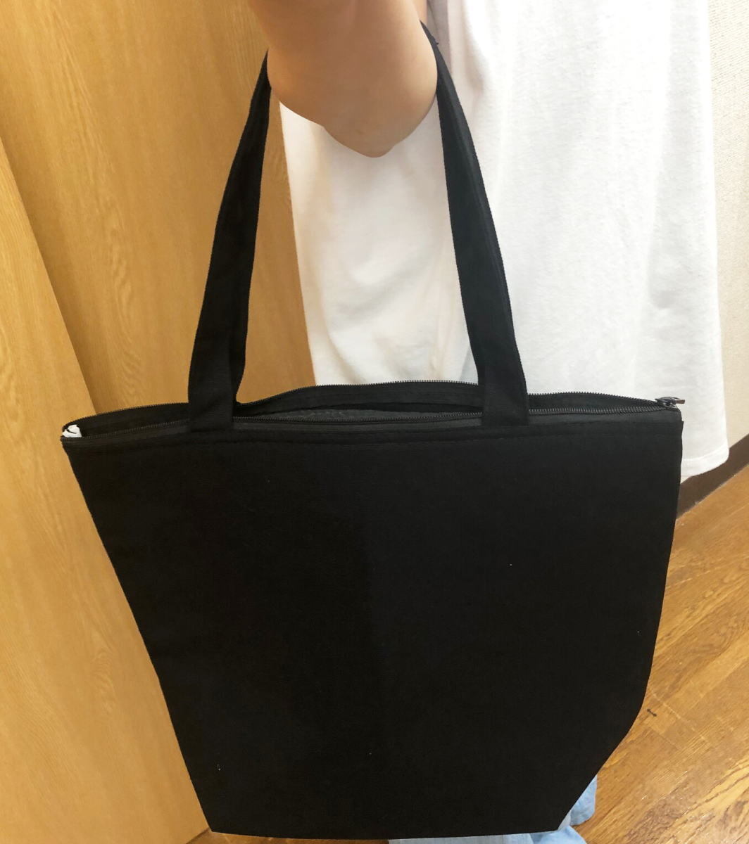 お弁当なども入れられる底はマチ付き、上部はファスナータイプ。