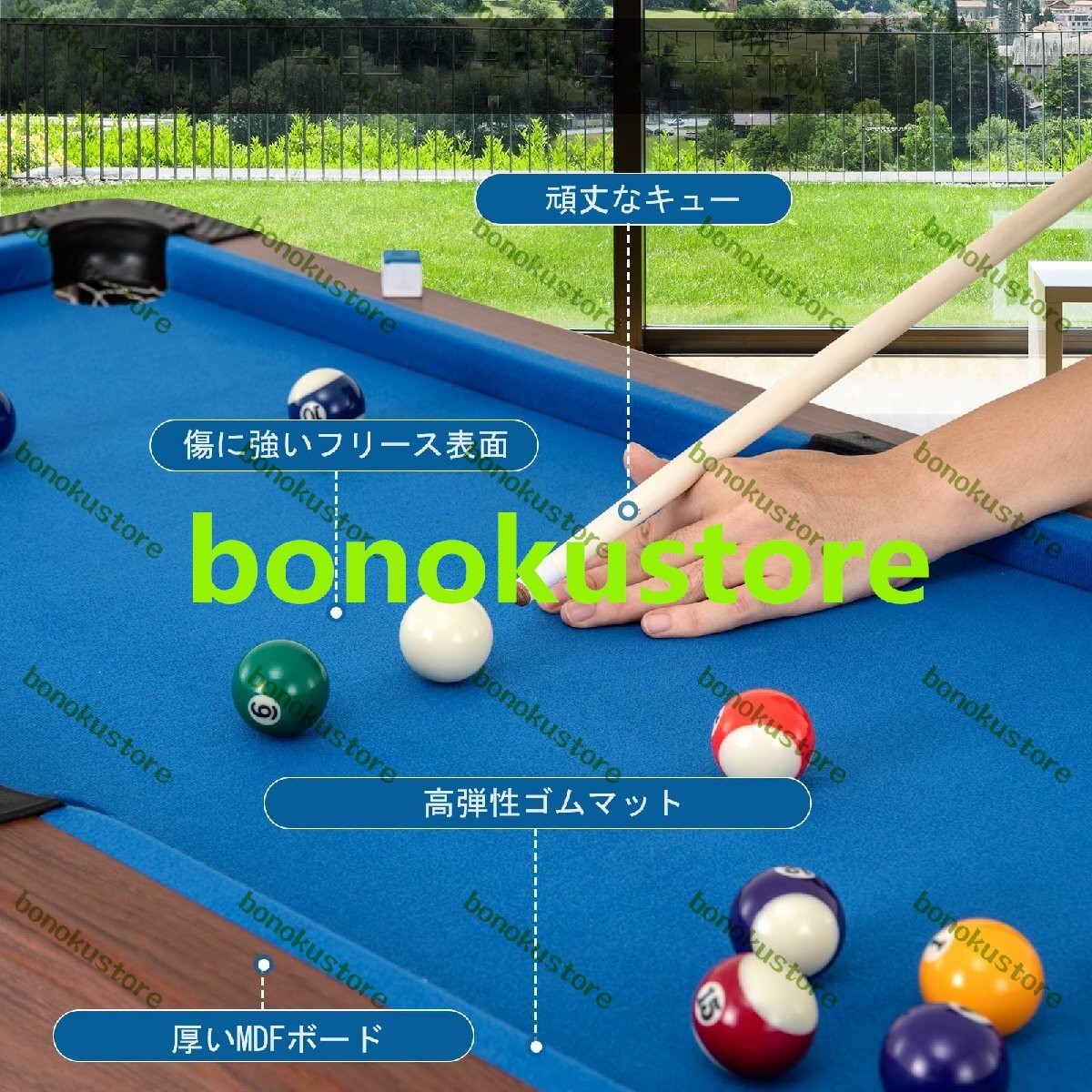 ●素材:MDF+EVA+ベルベット布 ●全体サイズ:122x 61x76cm ●本体重量:13kg ●カラー:ブルー ●付属品:キュー 2本、ナンバーボール 15個+ホワイトボール1個、チョーク 2個、トライアングルラック 1個、ブラシ1本