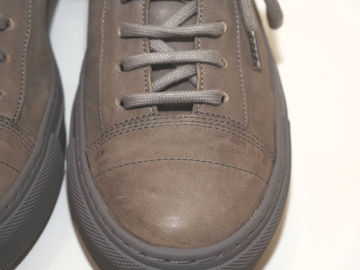 ムラ感ある色味のレザーを用いた7ホールローカットのキャップトゥスニーカーです。