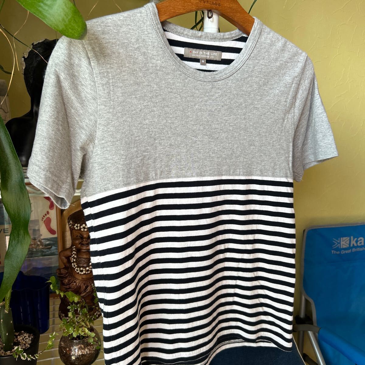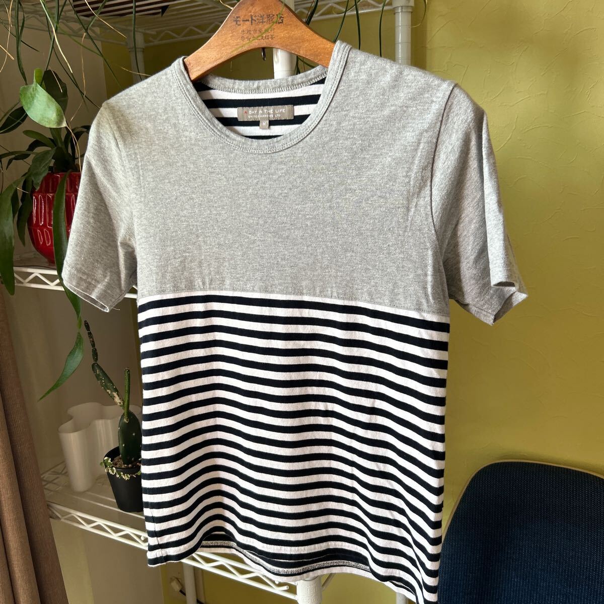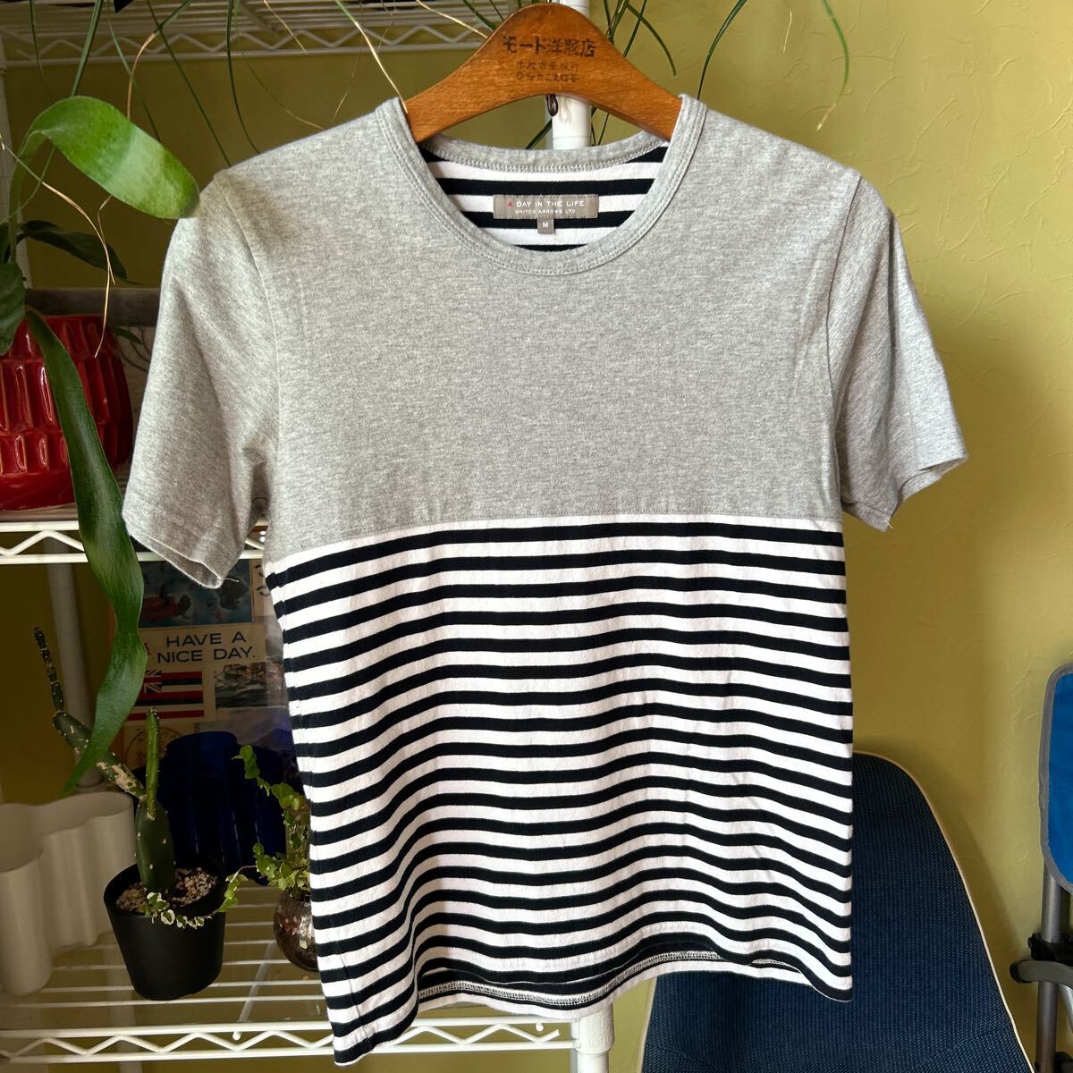 袖丈(脇下縫目〜袖先端)。多少の誤差はお許しください。良い雰囲気です。なめらかな綿100ニット ボーダー切り替えし できる限りダメージは説明させていただきますが、こちらが気づかない程度のわずかなしみ、よごれ、