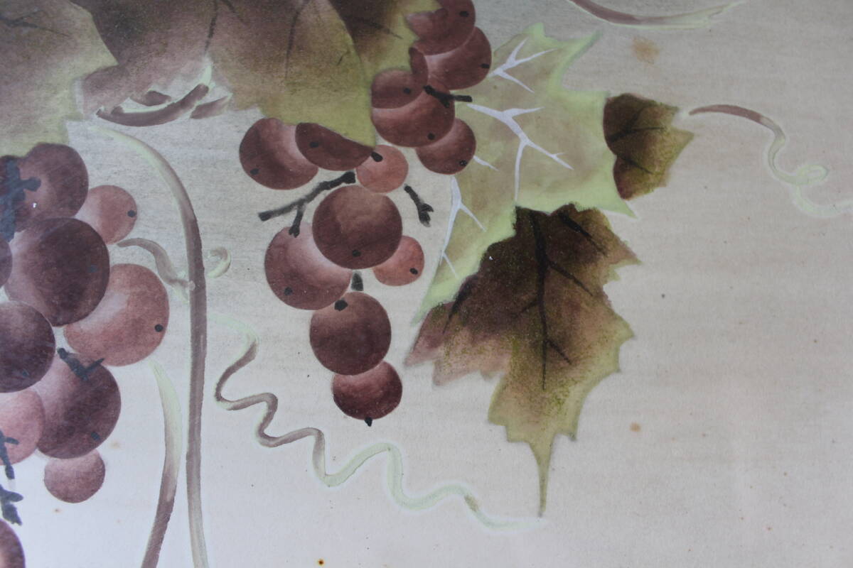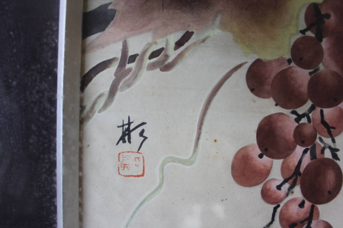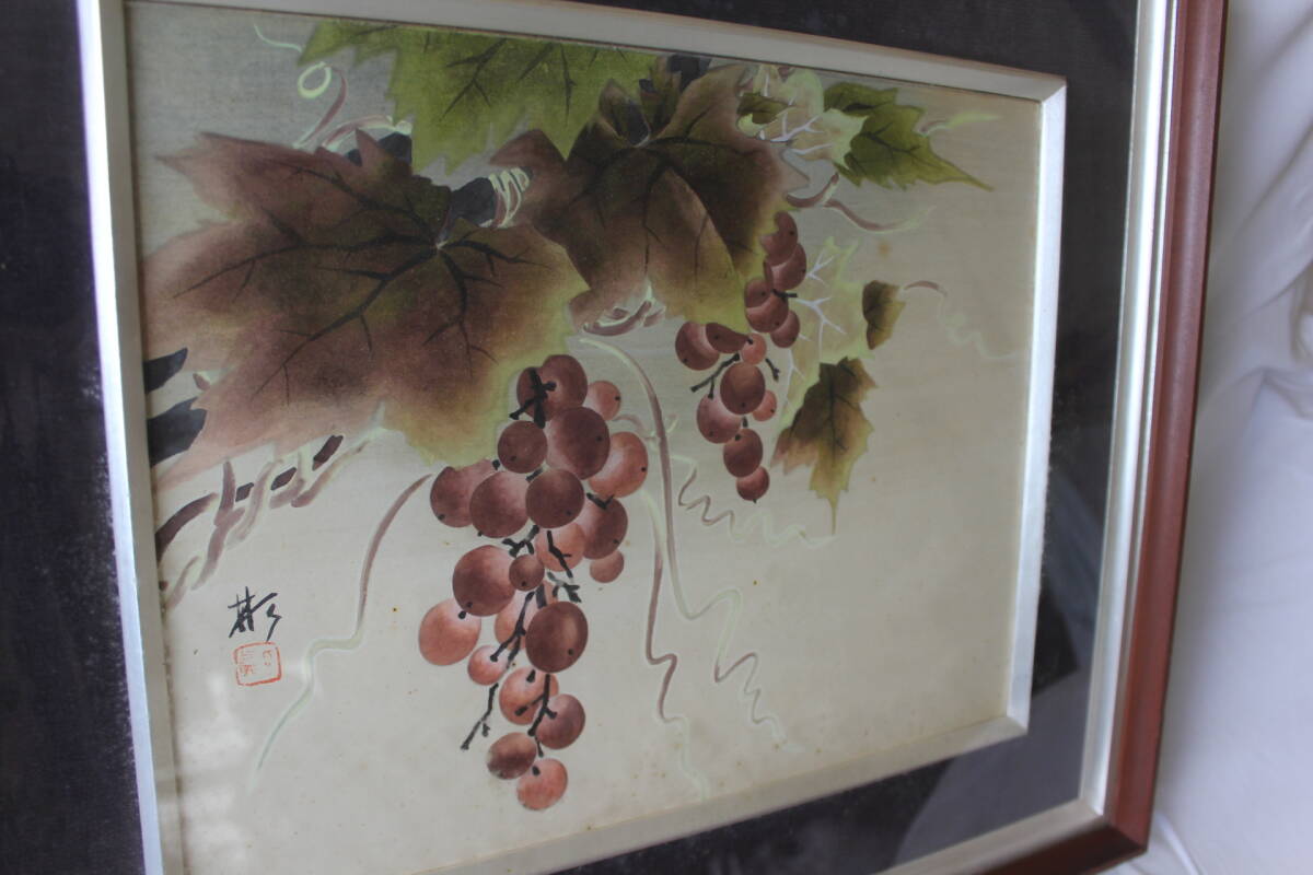 日本画、花鳥画署名・落款あり。葡萄(ブドウ)の絵画、額装付き。昭和レトロ,雲母,コレクション整理,コレクター,美術品1万円スタート