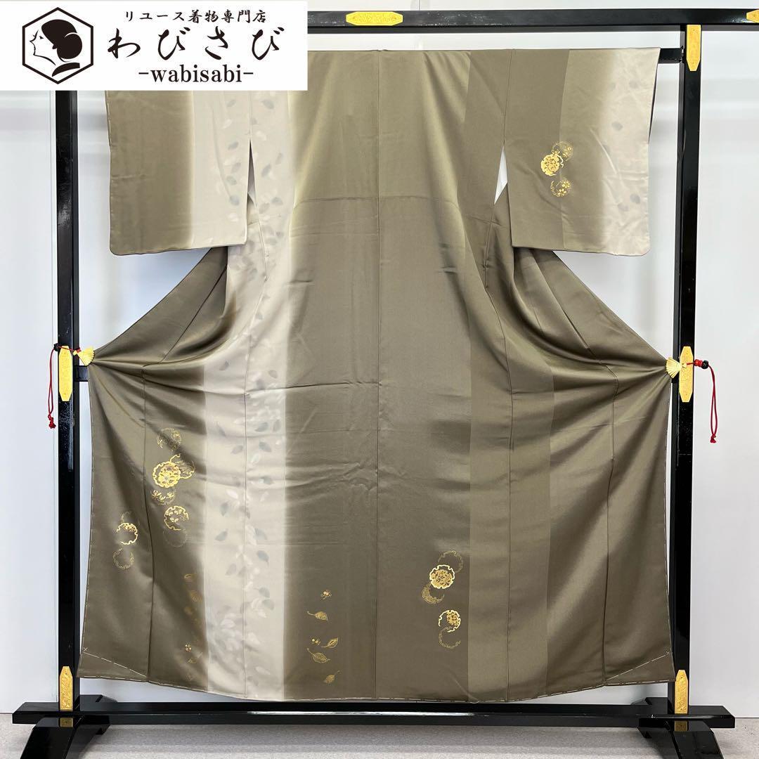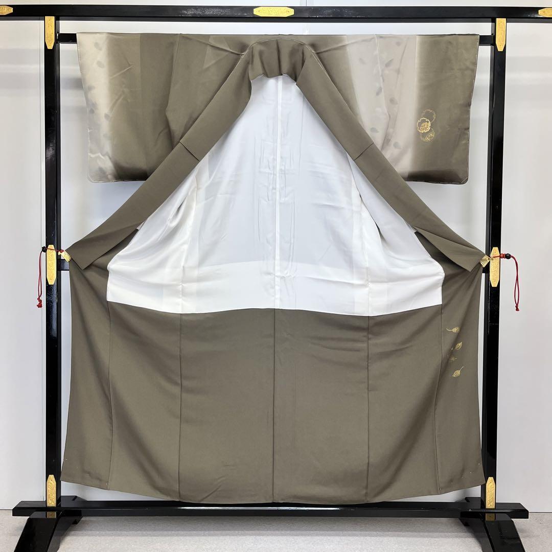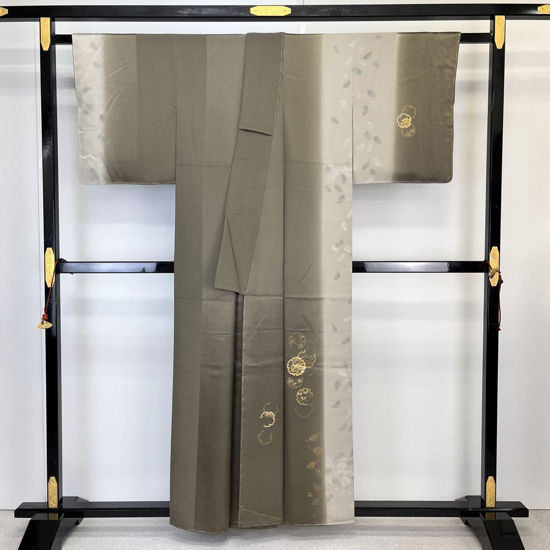 付下げ 雪輪に葉模様 縦縞模様 金彩 金駒刺繍 染分け 柳煤竹色 K-3965