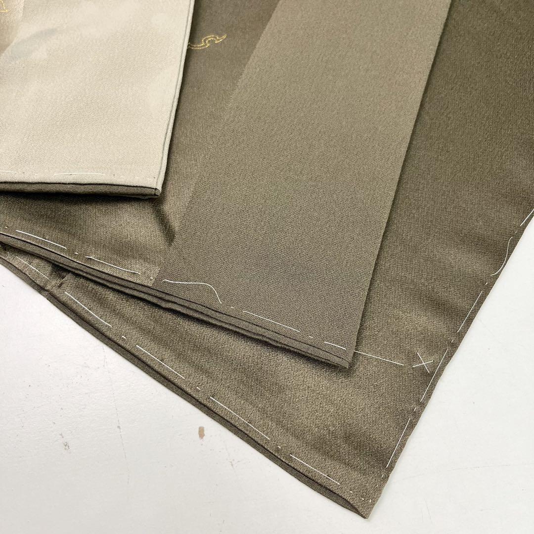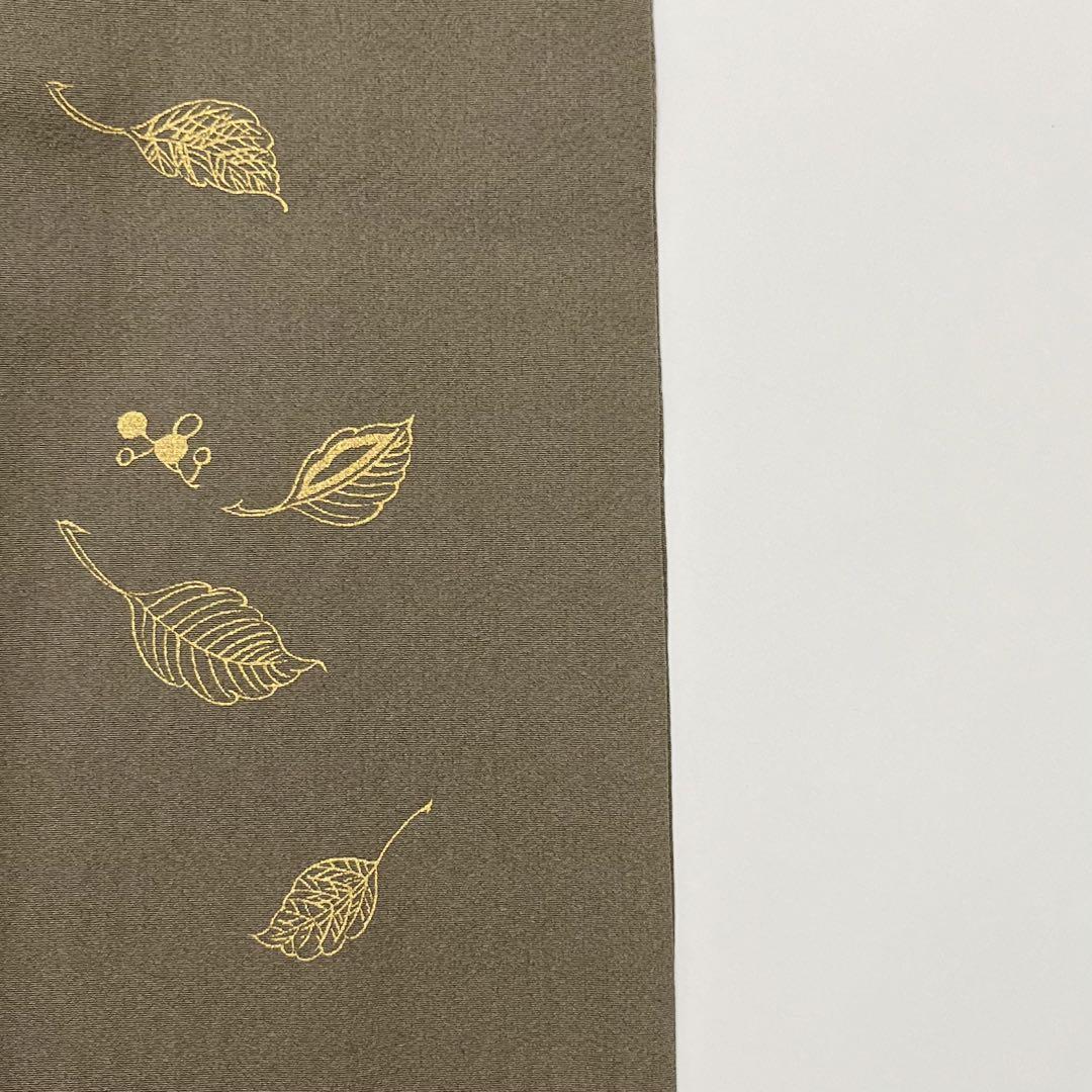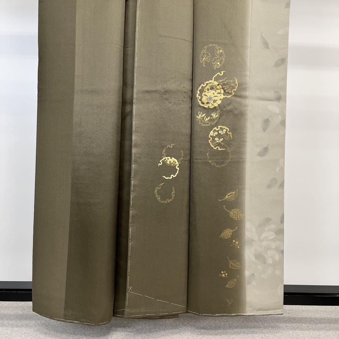 柳煤竹色ベースの染分け、金彩、金駒刺繍が使われた雪輪に葉模様がデザインされた落ち着きのあるお色味の素敵なお品でございます。