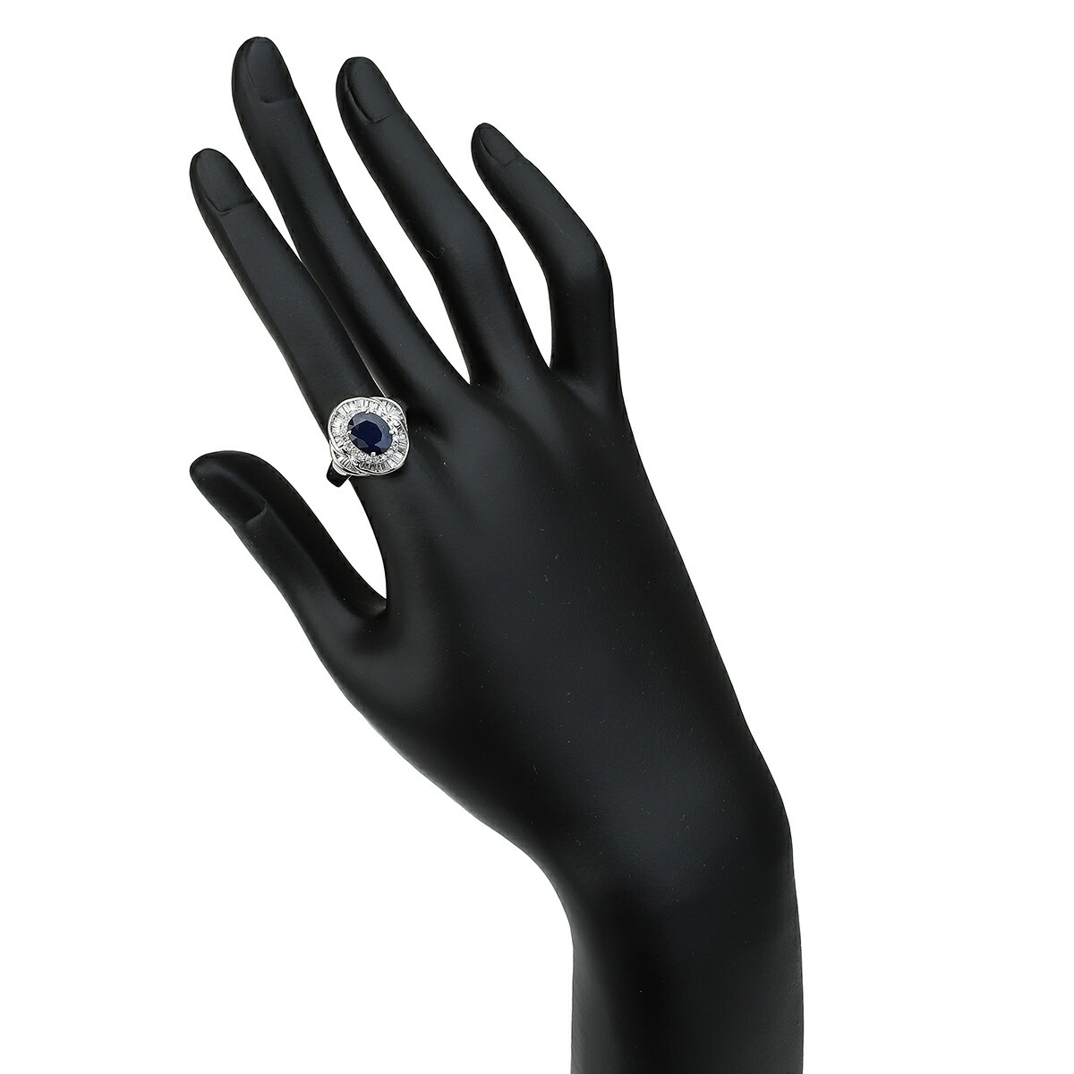 夜空のような深い青のカラーのサファイアがメインストーンとしてセットされているヘイローデザインリング。シンプルなデザインの中に程よい存在感がありお手元を優雅な雰囲気に変えてくれます。