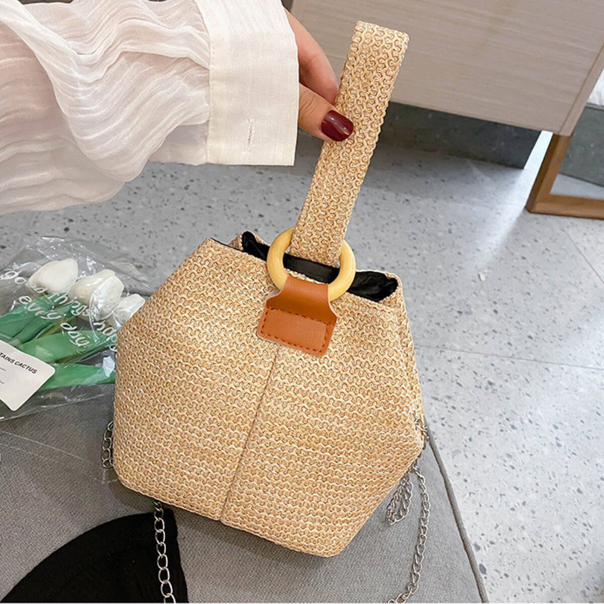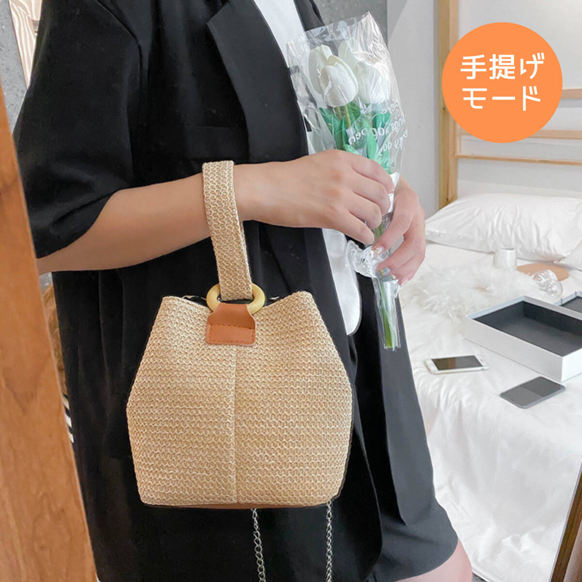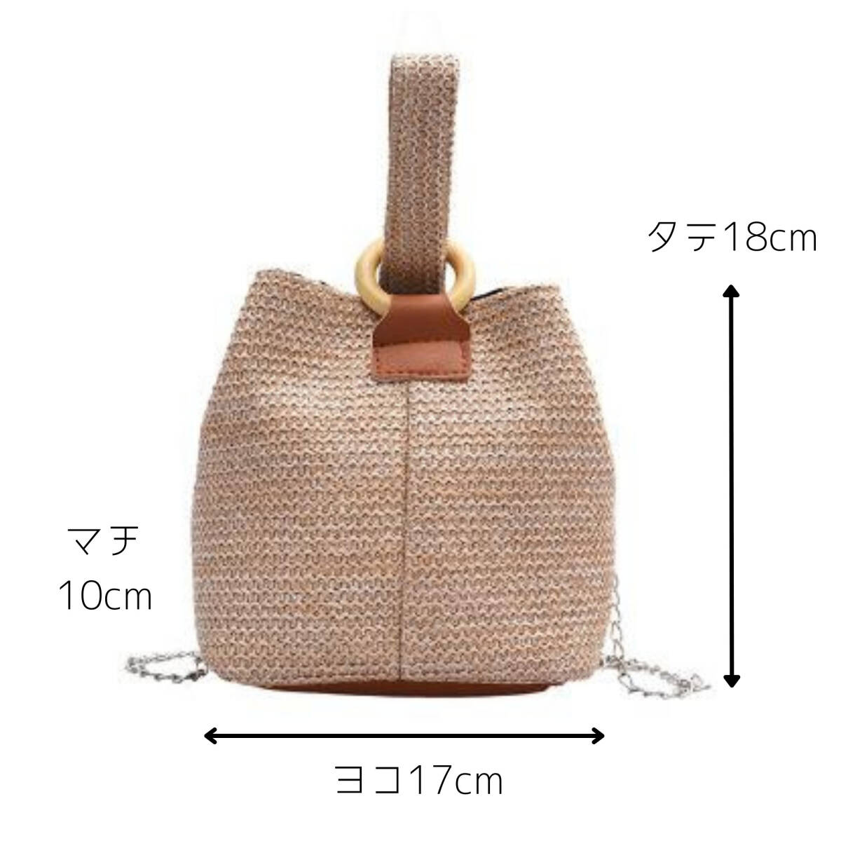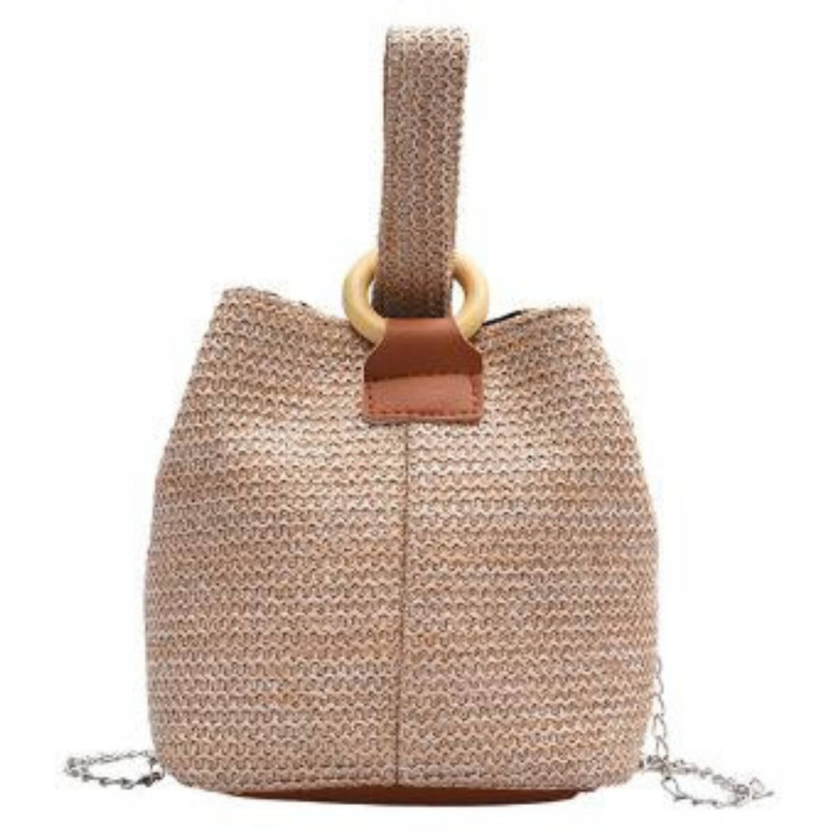 ワンハンドル ミニバッグ ショルダーバック メッシュ柄 2way チェーン ストラップ取り外し可能 (ライトベージュ)