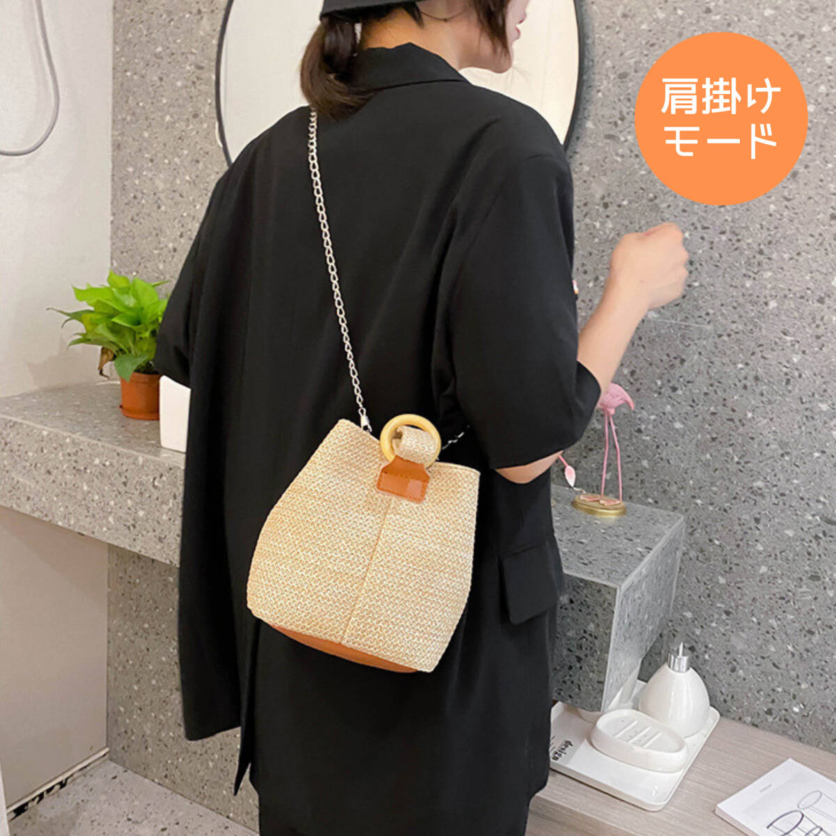 センターのワンハンドストラップ通しリングとナチュラルなメッシュ柄が特徴のリゾート感あふれるおしゃれなワンハンドルバッグです。