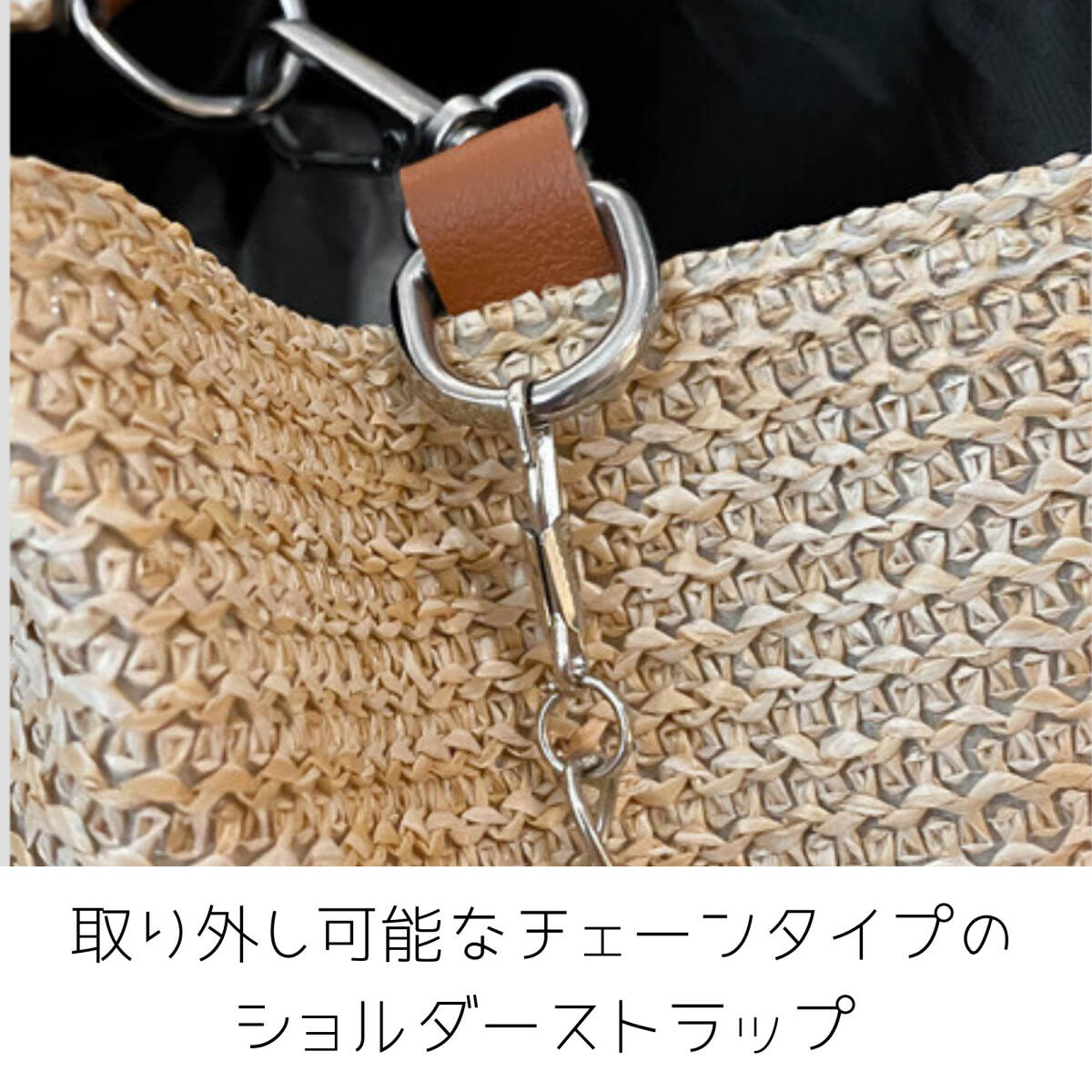 ワンハンドルタイプの手提げバックとしてだけでなく、付属の金属チェーンストラップを取り付けてショルダーポーチとしても使用可能です。