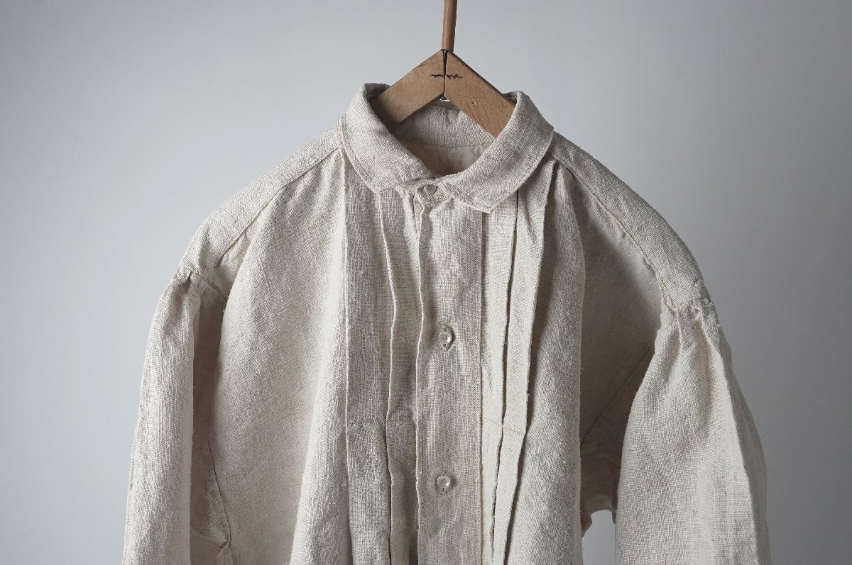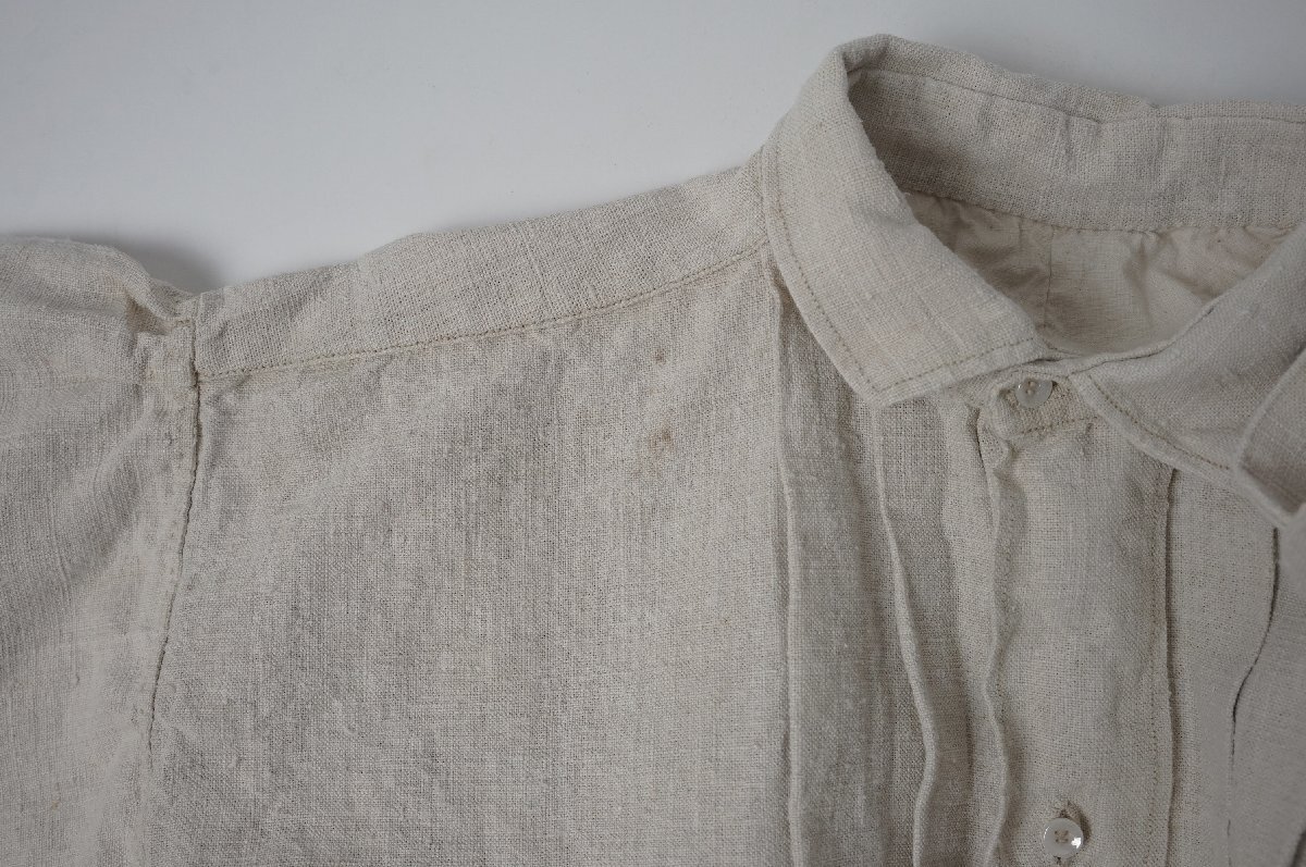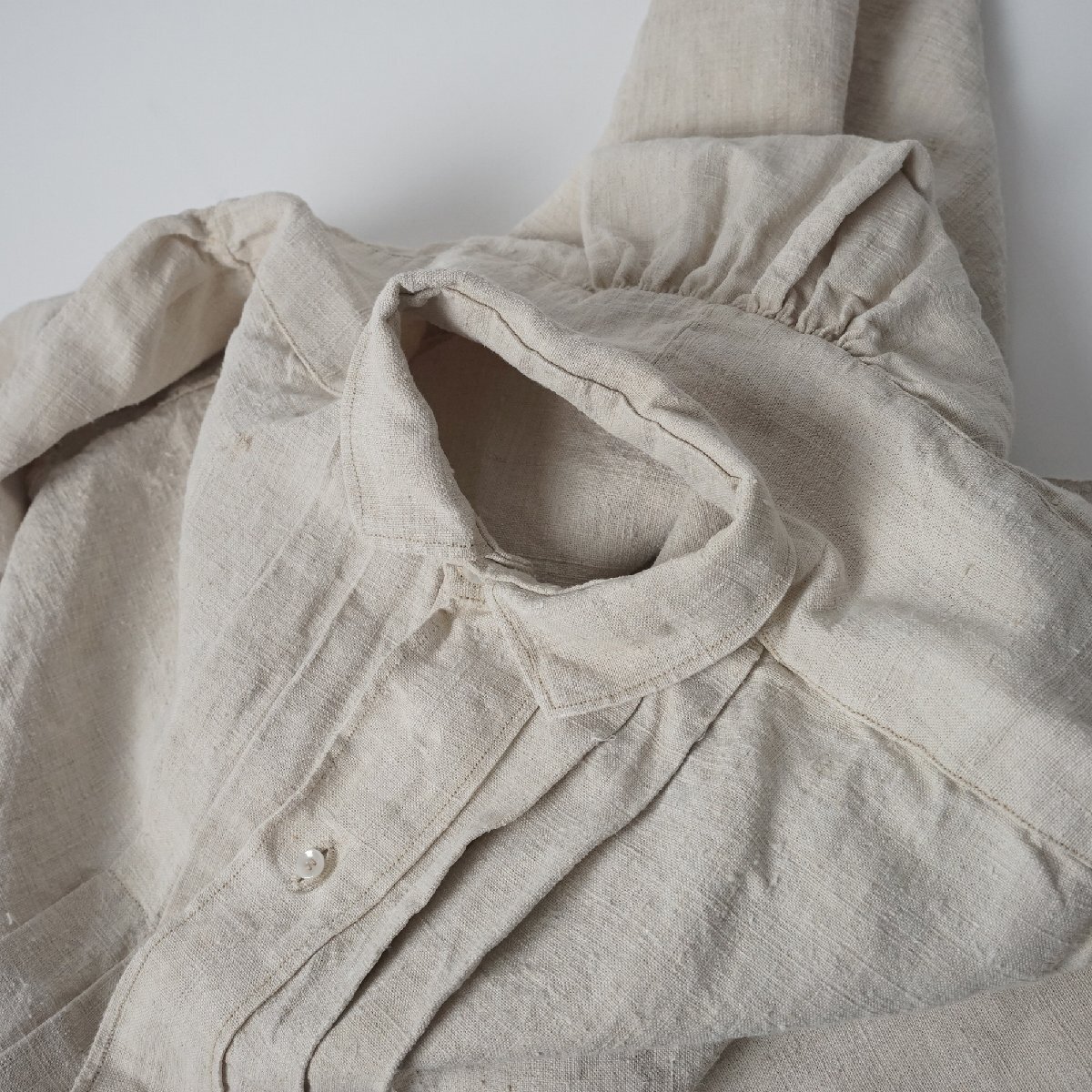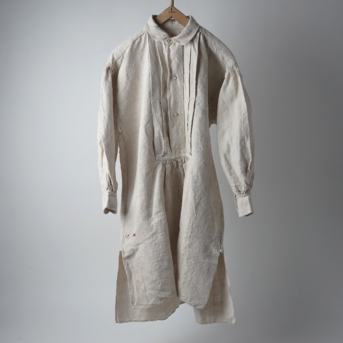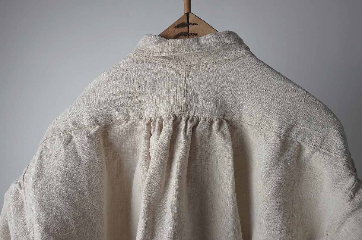 ○素材:襟も全てしっかりしたリネン素材です。袖口と前上部はボタンで閉じるデザインです。両脇裾に26cm程度のマチ付きスリットが入っています。右スリット付近に赤い刺繍があります。首の後ろと袖口のシャーリングがとても美しいシャツです。フランス購入品です。