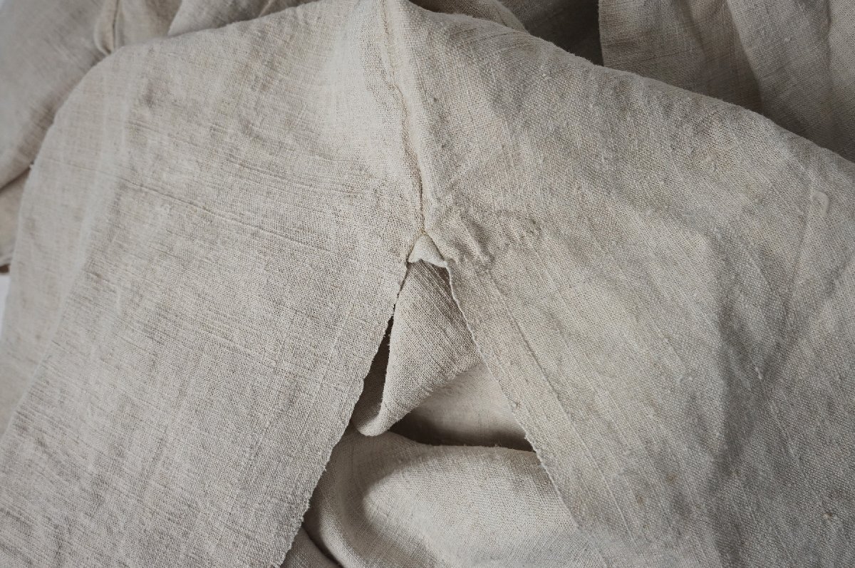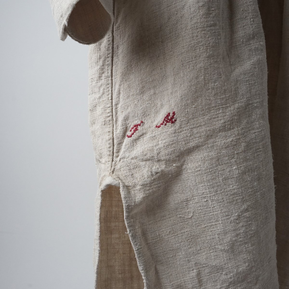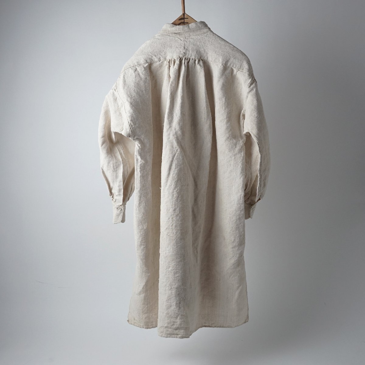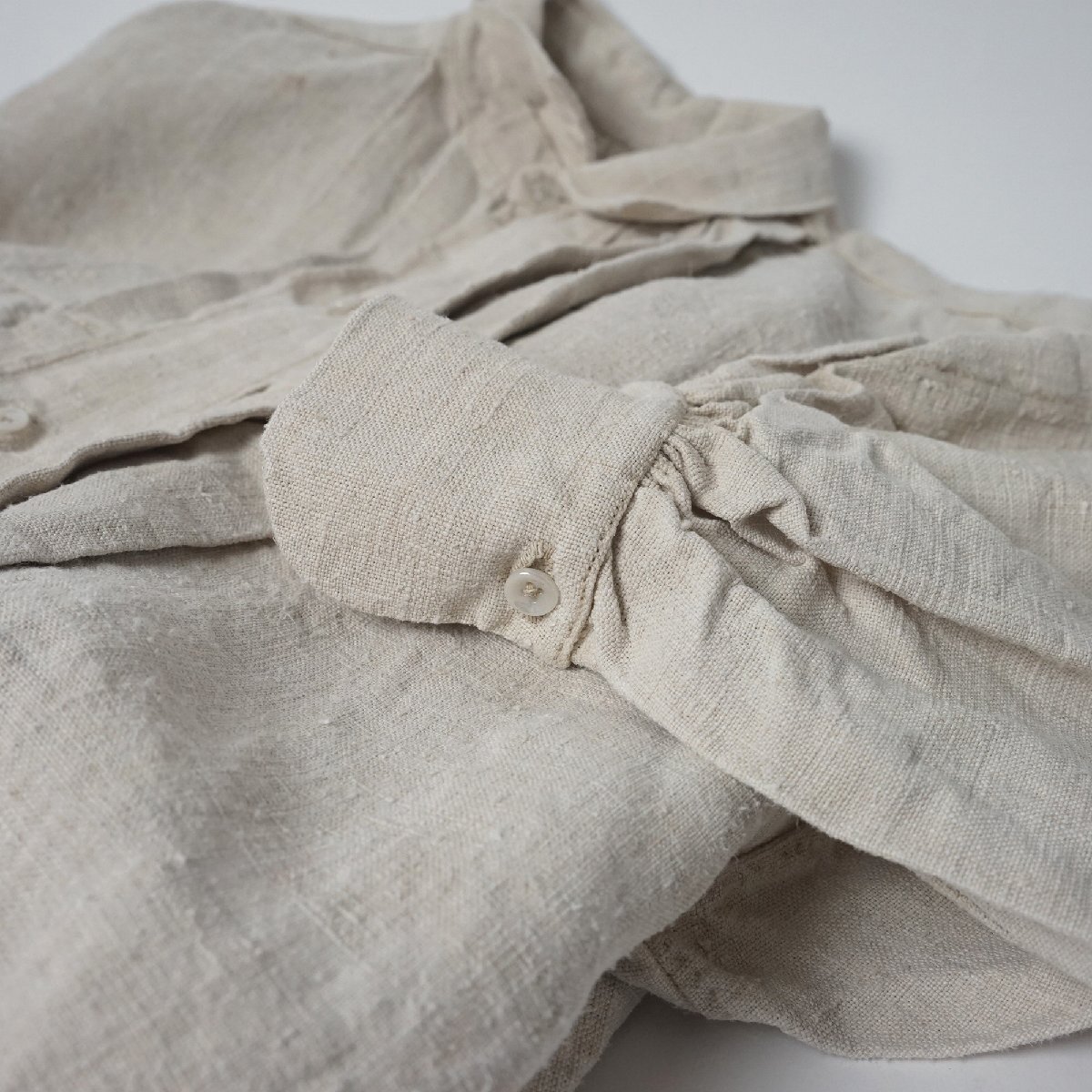 ○素材:襟も全てしっかりしたリネン素材です。袖口と前上部はボタンで閉じるデザインです。両脇裾に26cm程度のマチ付きスリットが入っています。右スリット付近に赤い刺繍があります。首の後ろと袖口のシャーリングがとても美しいシャツです。フランス購入品です。