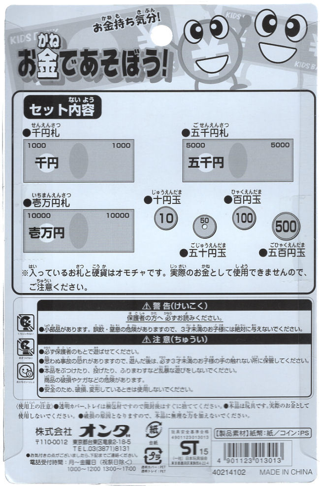 | ※市販品につき、下記以外の商品仕様は販売元や実店舗等でご確認下さい。 セット内容:千円札(75枚)・五千円札(75枚)・壱万円札(75枚) 十円玉(24枚)・五十円玉(6枚)・百円玉(8枚)・五百円玉(2枚) ※玩具貨幣につき、通貨としての使用はできません。 ・経年の二次流通品につき、パッケージには少なからず劣化や傷みがあるものとお考え下さい。 ・未開封品につき、内容物の状態の説明・初期不良等への対応は出来ません。開封しての内容確認などは行いません。 |
