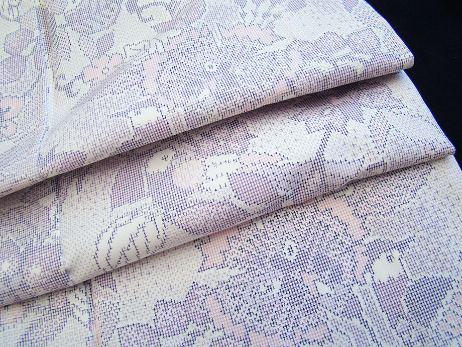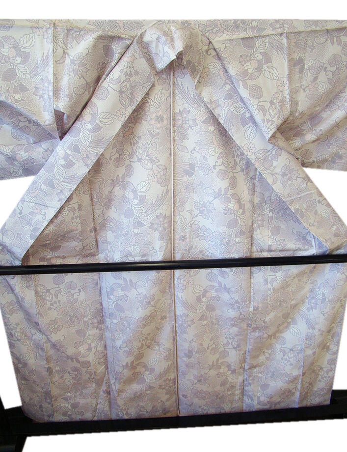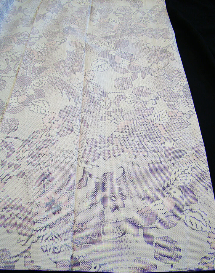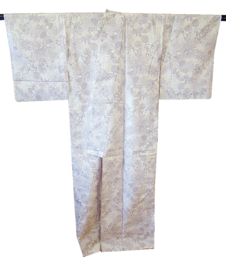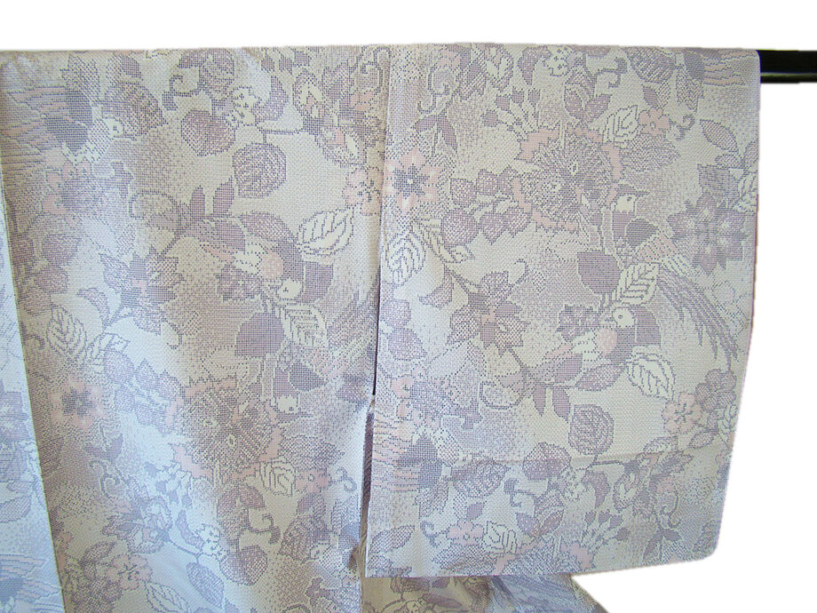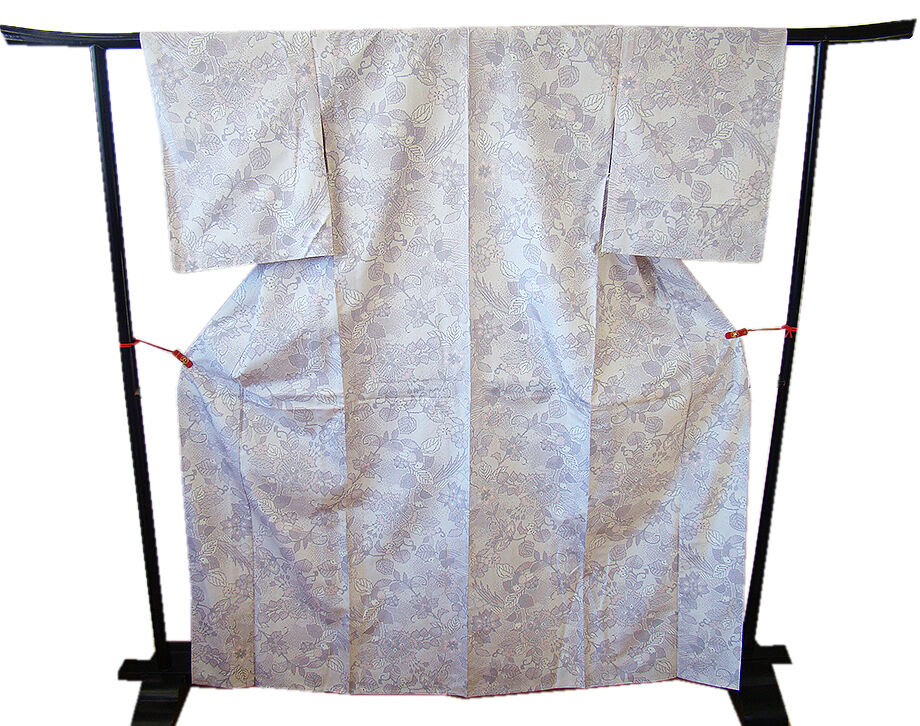 | 商品説明 | こちらのお品は「単衣」ですので5月、6月、9月にお召頂ければと思います。 着物には、大きく分けて「袷(あわせ)の着物」と「単衣(ひとえ)の着物」と「夏着物」があります。 反物(表地)を着物に仕立てるときに、裏地類をつけるものを袷の着物、 つけないものを単衣の着物と呼び、胴裏や八掛といった裏地がつかない一枚ものの着物です。 また裏地がないため、座る時などにヒップのラインが目立たないよう、 居敷当て(いしきあて)の生地をつけることもあります。 居敷当ては付いておりません。 しなやかな手触りの大島紬の様なハリやシャリ感のあるさらりとした単衣の紬地の平織の生地、 ミルキーホワイト色地に薄葡萄、鴇色等の花鳥の織柄が洒落感ある粋な仕上がりとなっております。 |