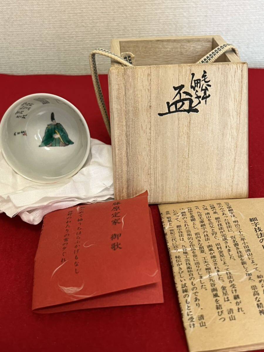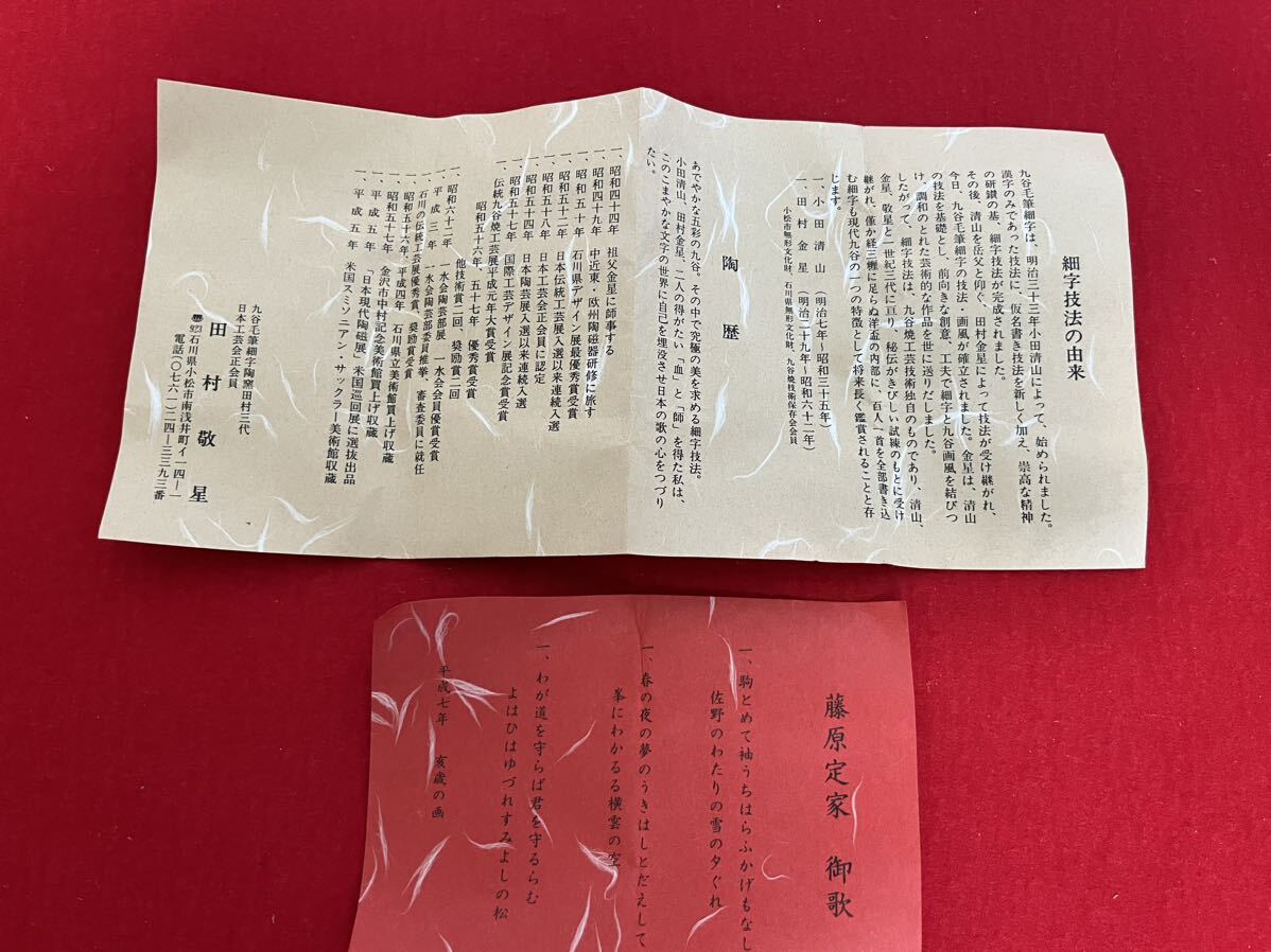 「九谷毛筆細字(さいじ)技法」とは、主に和歌などの古典文学を極細の毛筆で磁器に描き込む技法です。明治以降、九谷焼の繊細な絵付けに見合う表現として石川県の南部地方で独自に発展してきました。 現在まで一世紀以上に亘り、田村家に一子相伝の技法として受け継がれています。
