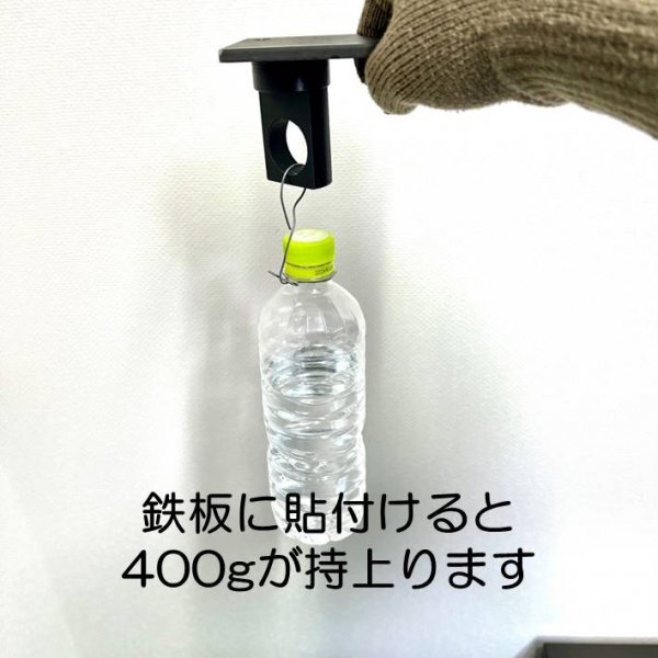 鉄板に取り付けると400g程度持ち上げることができる程の強さです。よくある冷蔵庫に紙を止めるマグネット位の強さのイメージです。