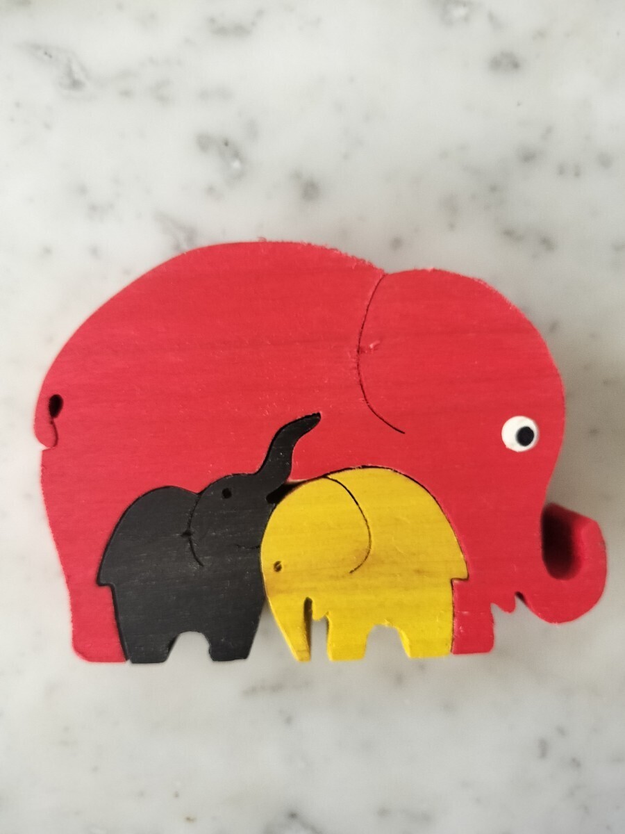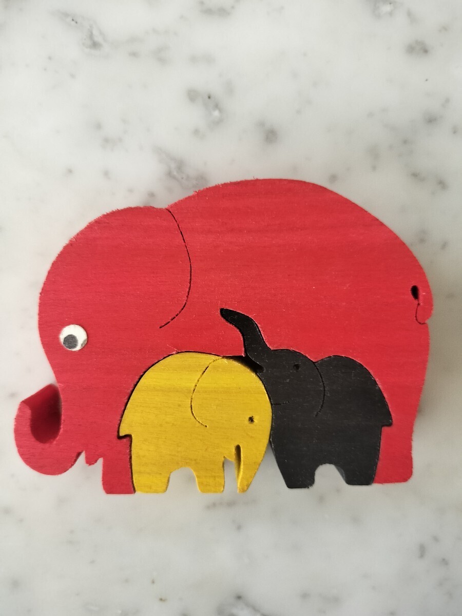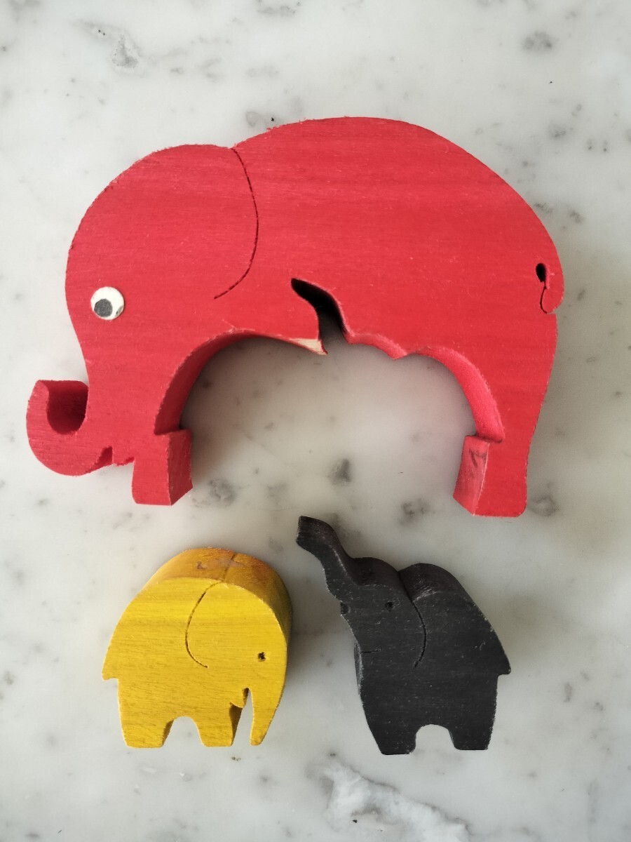 黄色と黒の子象を組み合わせて大きな赤象を作るバズルで、とても可愛い知育玩具です。赤象の下部に欠けが見られますが、組み立てには影響しません。この欠け以外は綺麗な状態と思いますが、返品やクレームには応じられませんので、完璧を求める方や神経質な方は入札をお控え下さい。