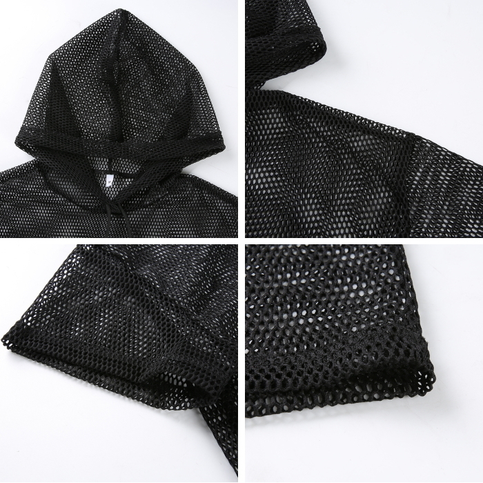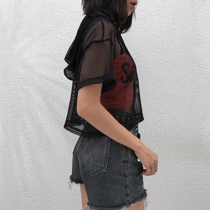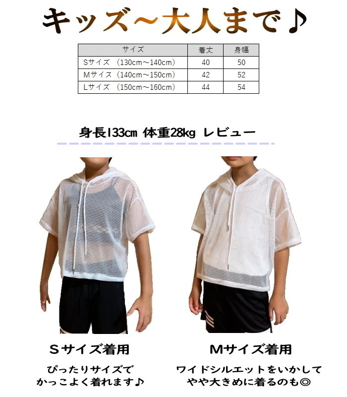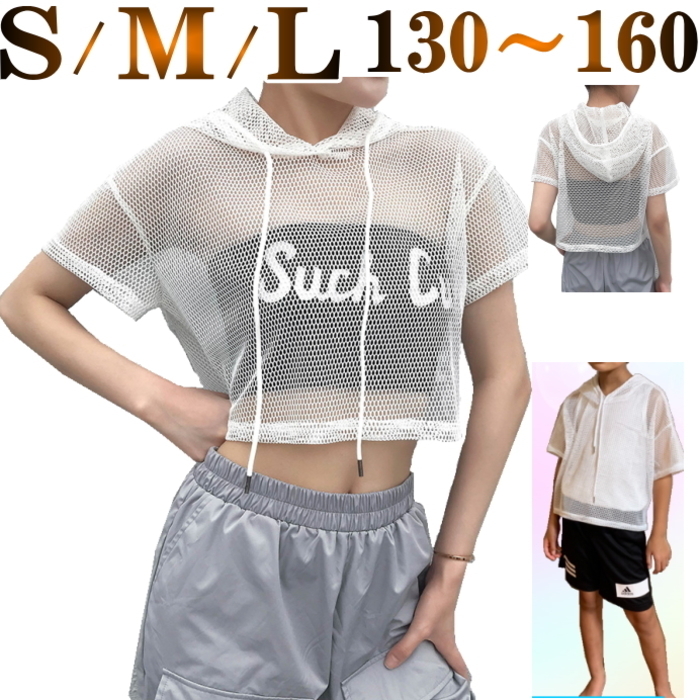 【Mサイズ-白】ダンス 衣装 ヒップホップ トップスキッズ レディース ガールズ ショート丈 メッシュ パーカー フード付き cy213n-p0