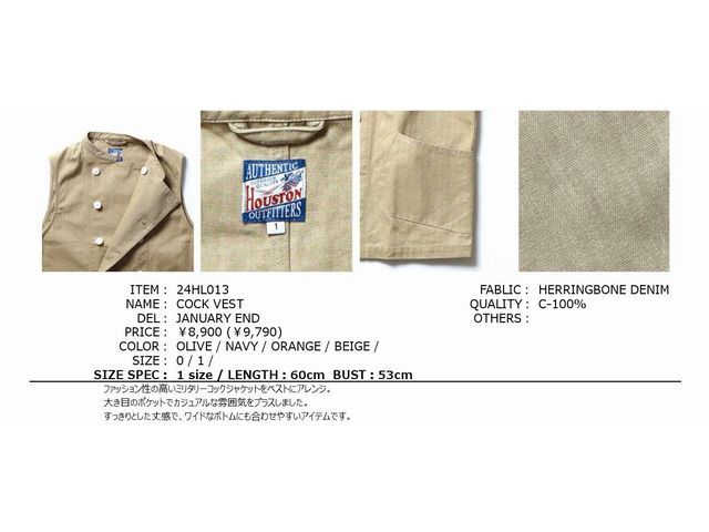 【送料無料 49%OFF】HOUSTON ヒューストン ウーマン COCK VEST ・ コックベスト NO.24HL013 ORANGE_1(L相当)サイズ