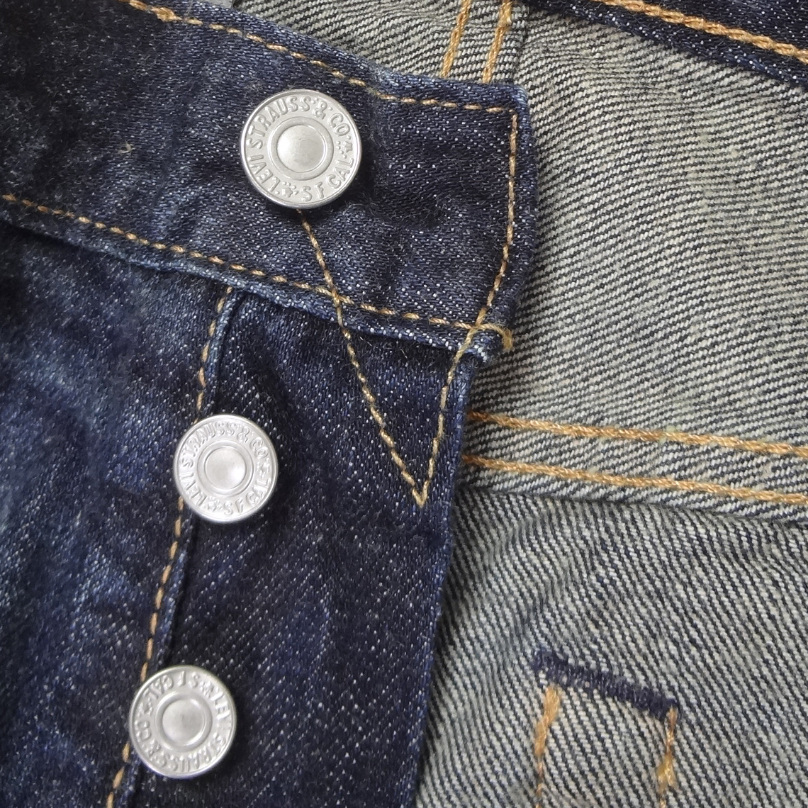 リーバイスの501ボタンフライ、00501-1485/オーセンティックヴィンテージ、素材は綿100% ダメージジーンズ
