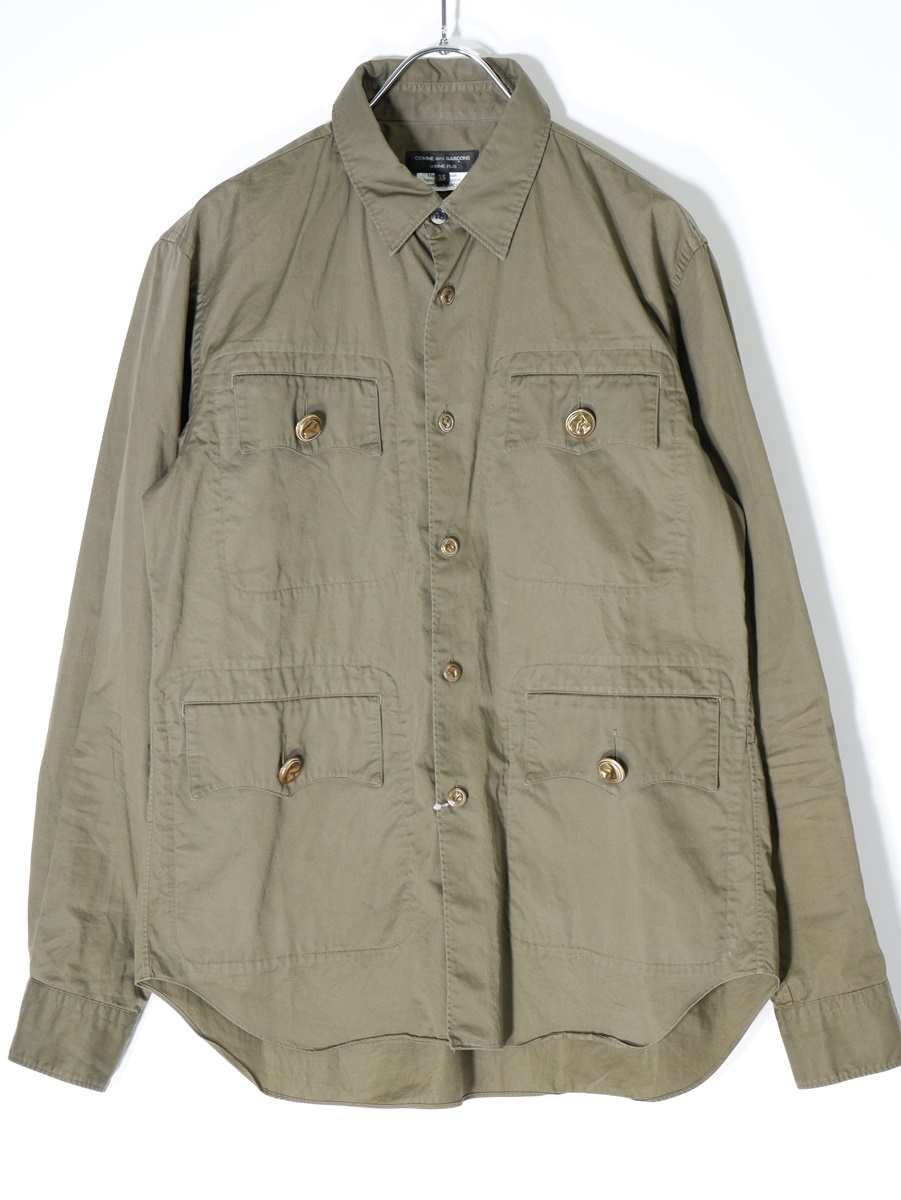 素材感一般的なシャツ地 透け感なし 裏地なし ストレッチなし 開閉デザインボタン 付属品(取り外し可)なし 商品情報2015春夏テーマはアンチ・ウォー(反戦)。銃弾で潰れたようなボタンがポイントになったコムデギャルソンらしいアーミーシャツ。 |