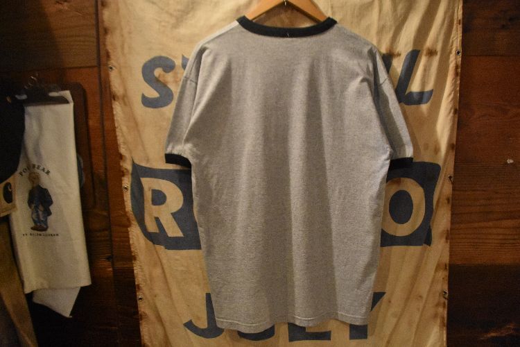 グッドプリント◎USA製90sビンテージMurinaボディGOLDFINGERゴールドフィンガー半袖リンガーTシャツLグレー×ネイビー100綿バンドn24967