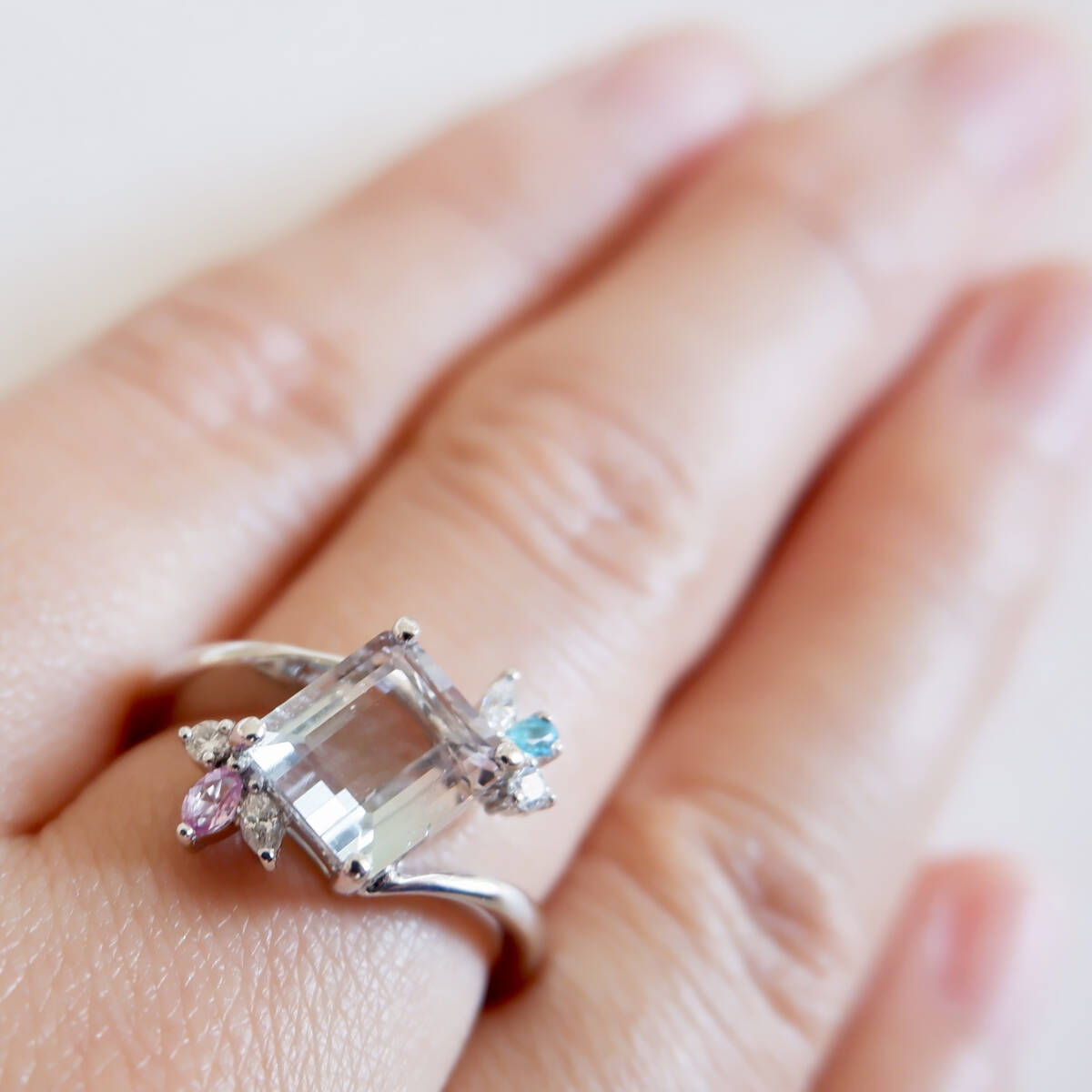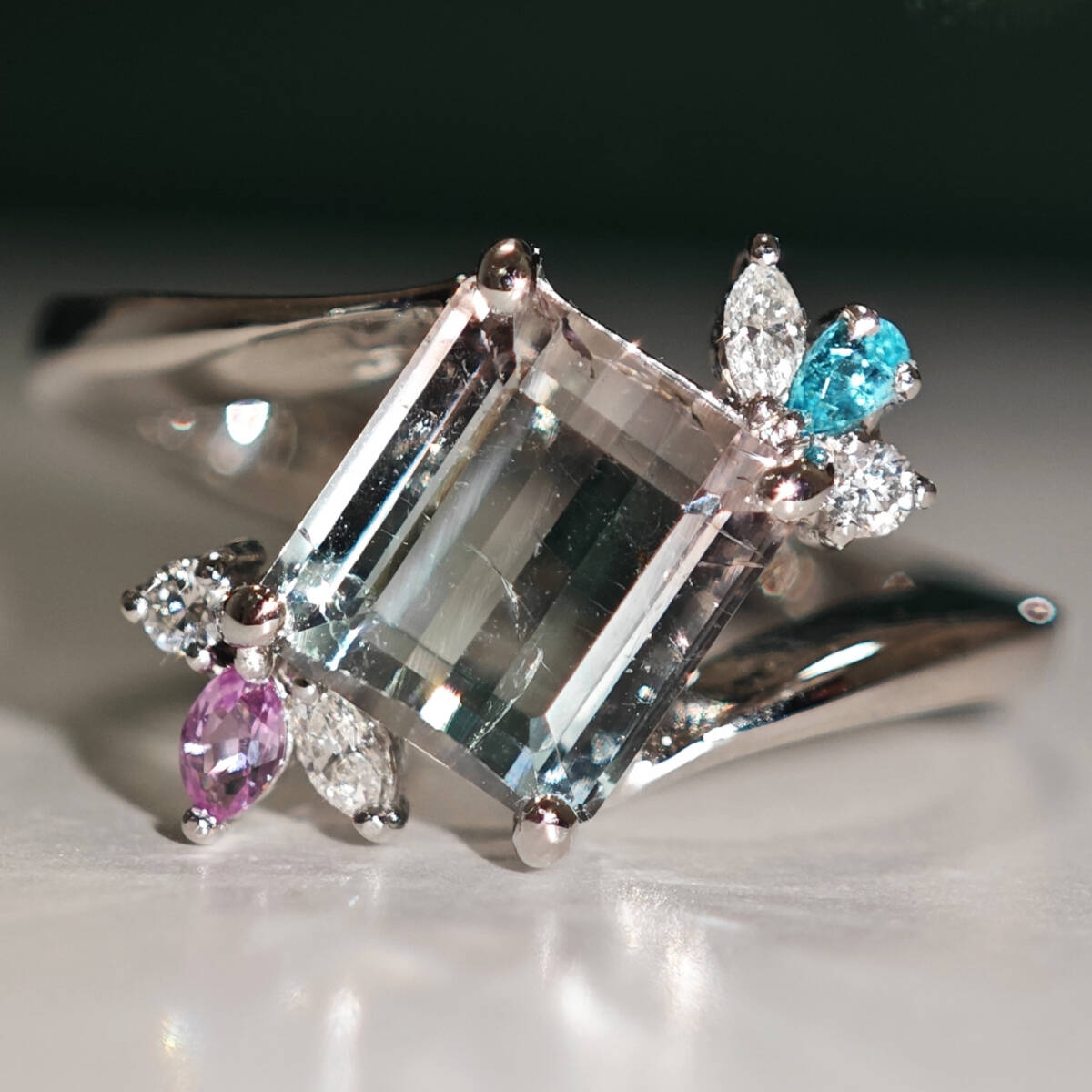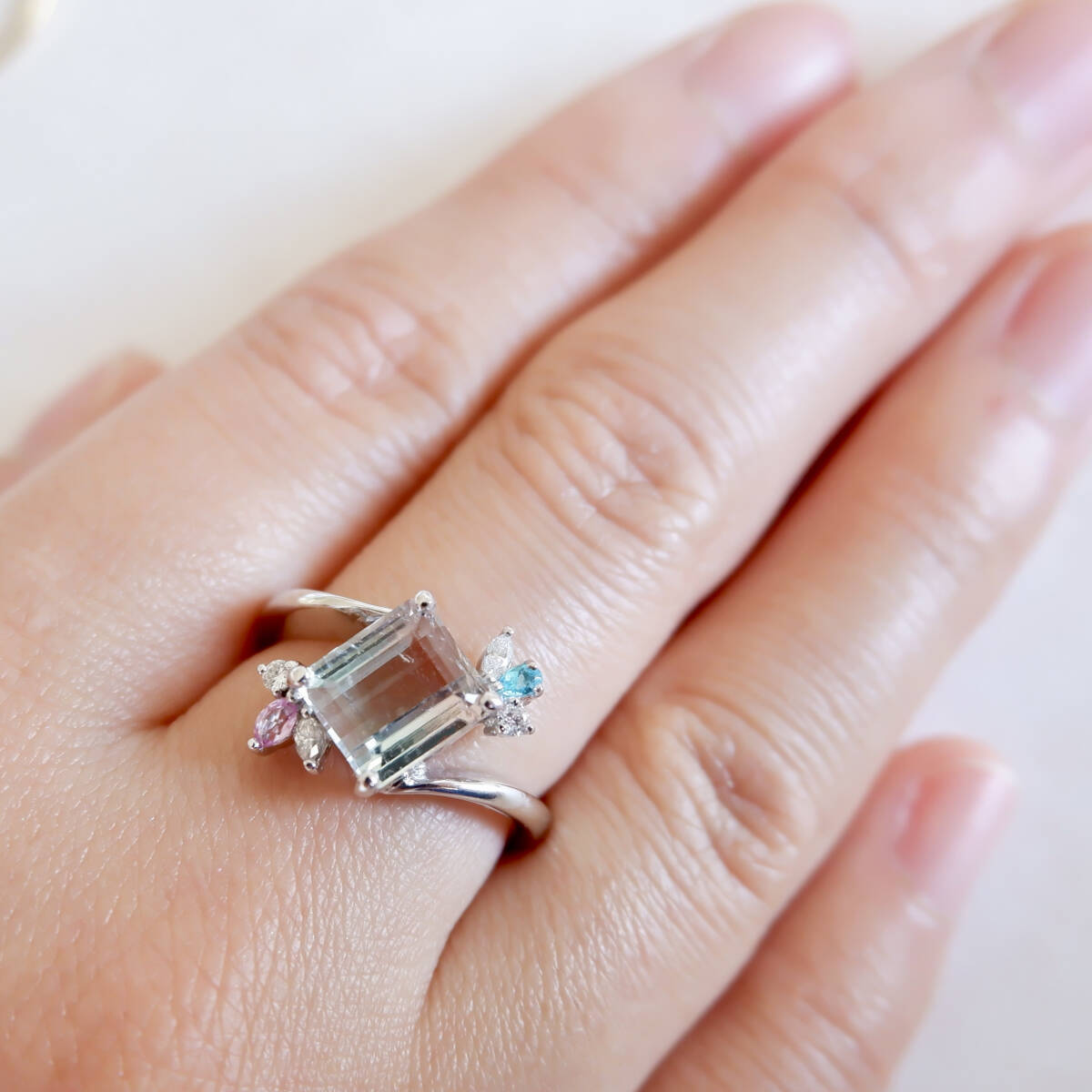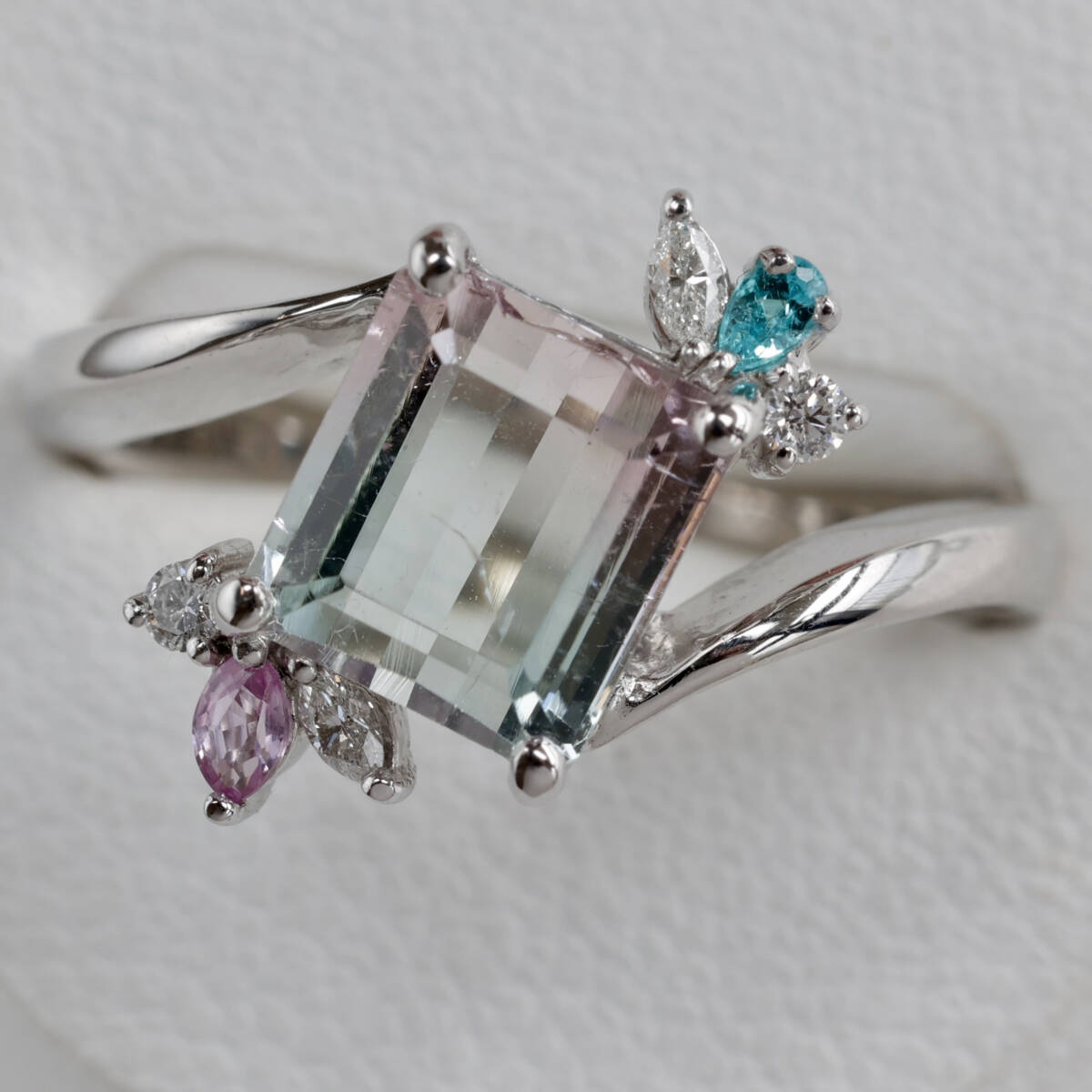淡く爽やかなお色味のバイカラートルマリンがメインのリング。
