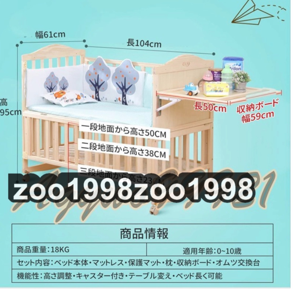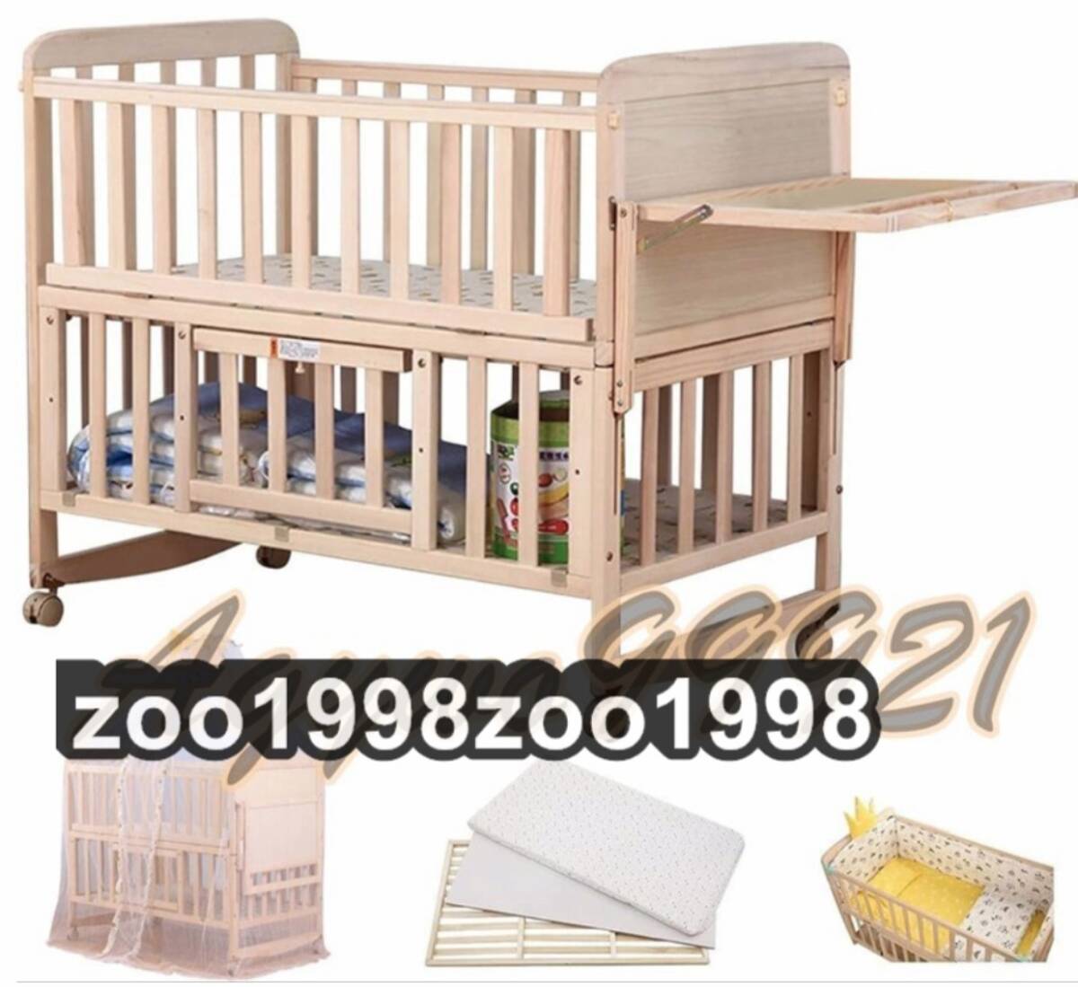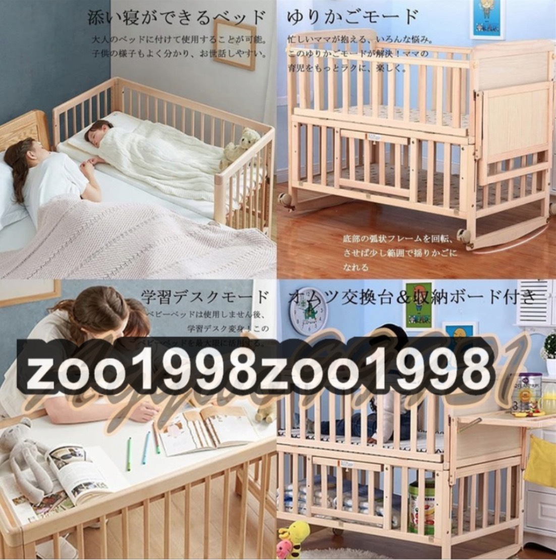 ★状態:新品未使用 ★商品情報:√適用対象:0~10歳赤ちゃん √商品機能:ゆりかご+プレイヤード+ベビー用品収納+高さ調整+子供テーブル ★移動便利:キャスター付きなので、ママが家事をする時にもベビーの活動を目に入れます。食事を作ったり、洗濯をしたり時赤ちゃんをベッドに置いて適度の高さを調整してオッケーです。便利または機能満載な赤ちゃんベッドです。テーブルに変えまたはコンパクトで使いやすいので、小さな赤ちゃん時や子供の時など、どこへ行っても赤ちゃんを快適・快適な環境で眠らせてあげられます。成長に合わせて長く使える多機能用ベビーベッドです。 ★頑丈でしっかり:丈夫でしっかりした木製ベビーベッドとして、安定感もあり長く使えます。 ★高さ調整可能:高さ三段の調整可能ですので、様々の家具にピッタリします。ママの腰をよく保護できるし、ベビーのおむつを替える時も便利です。また、木の色味なので、家具によくマッチし、どこにも邪魔になりません。 ★ご安心使用セット:本体&マットレス&枕&蚊帳付き&ベッドガードクッション