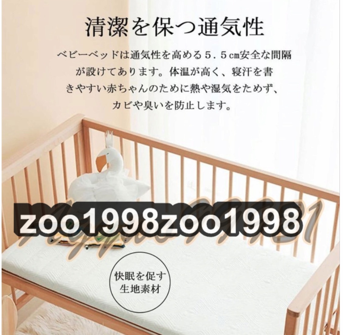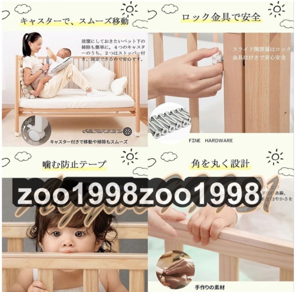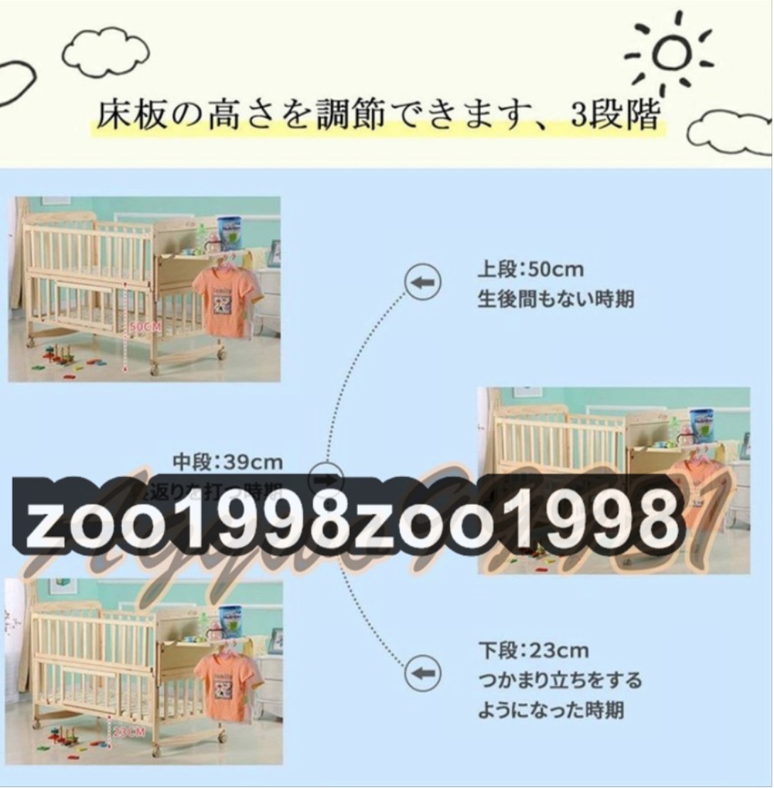 ★状態:新品未使用 ★商品情報:√適用対象:0~10歳赤ちゃん √商品機能:ゆりかご+プレイヤード+ベビー用品収納+高さ調整+子供テーブル ★移動便利:キャスター付きなので、ママが家事をする時にもベビーの活動を目に入れます。食事を作ったり、洗濯をしたり時赤ちゃんをベッドに置いて適度の高さを調整してオッケーです。便利または機能満載な赤ちゃんベッドです。テーブルに変えまたはコンパクトで使いやすいので、小さな赤ちゃん時や子供の時など、どこへ行っても赤ちゃんを快適・快適な環境で眠らせてあげられます。成長に合わせて長く使える多機能用ベビーベッドです。 ★頑丈でしっかり:丈夫でしっかりした木製ベビーベッドとして、安定感もあり長く使えます。 ★高さ調整可能:高さ三段の調整可能ですので、様々の家具にピッタリします。ママの腰をよく保護できるし、ベビーのおむつを替える時も便利です。また、木の色味なので、家具によくマッチし、どこにも邪魔になりません。 ★ご安心使用セット:本体&マットレス&枕&蚊帳付き&ベッドガードクッション