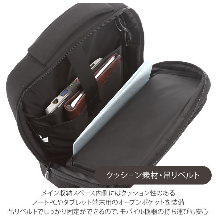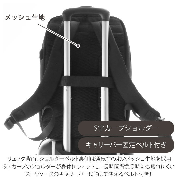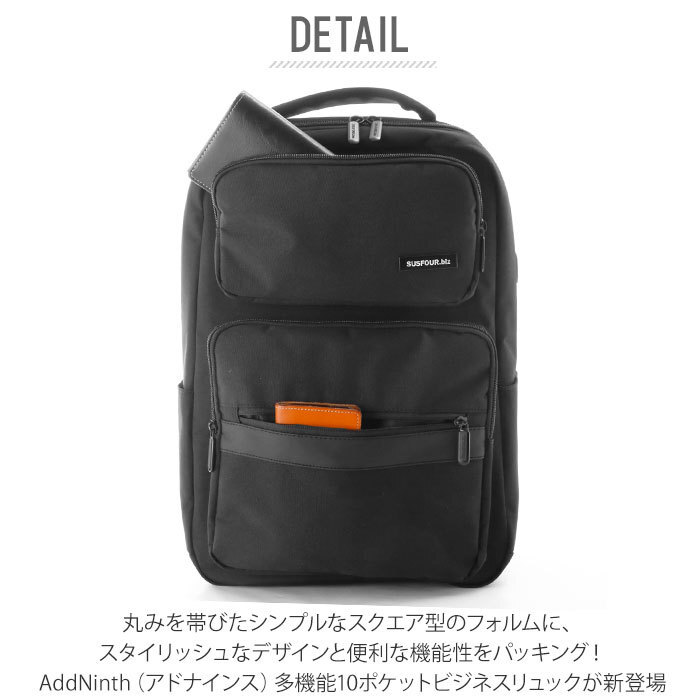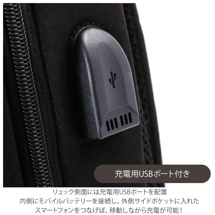 | 商品説明 | ・丸みを帯びたシンプルなスクエア型のフォルムに、スタイリッシュなデザインと便利な機能性をパッキング!AddNinth(アドナインス)多機能10ポケットビジネスリュックが新登場。 ・フロントに2つの便利なラウンド型ファスナーポケットを配置。ポケットには程よくマチがあり、スマートフォンや長財布、A5サイズの手帳など、小物を自分仕様に整理して収納が可能。 ・メイン収納スペースは、大きく開いて内部が見やすいダブルファスナー式。パッと見はスリムな外観なのに、1泊2日程度の出張や旅行にも余裕で対応できる収納力! ・メイン収納スペース内側にはクッション性のあるノートPCやタブレット端末用のオープンポケットを装備。吊りベルトでしっかり固定ができるので、モバイル機器の持ち運びも安心。 ・リュック側面には充電用USBポートを配置。内側にモバイルバッテリーを接続し、外側サイドポケットに入れたスマートフォンをつなげば、移動しながら充電が可能! ・リュック外側に二つのサイドポケット、フロントポケット内には仕切りポケットやペン差しなど、収納ポケットが充実。ビジネスに必要な小物がすっきりと整理が可能。 ・リュック背面、ショルダーベルト裏側は通気性のよいメッシュ生地加工生地を採用。S字カーブのショルダーが身体にフィットし、長時間背負う時にも疲れにくいデザイン。 ・リュック上部にはクッション性があり、グリップ感抜群のハンドル付きなので、手持ちのビジネスバッグとしても使用可能。 ・リュック背面にはスーツケースのキャリーバーに通して使えるベルト付き。旅行や出張時のサブバッグとしても大活躍! ・ビジネスはもちろんプライベートでも、ON/OFFで使用できる落ち着いたカラーバリエーション。男性・女性問わず使えるユニセックス仕様。 |