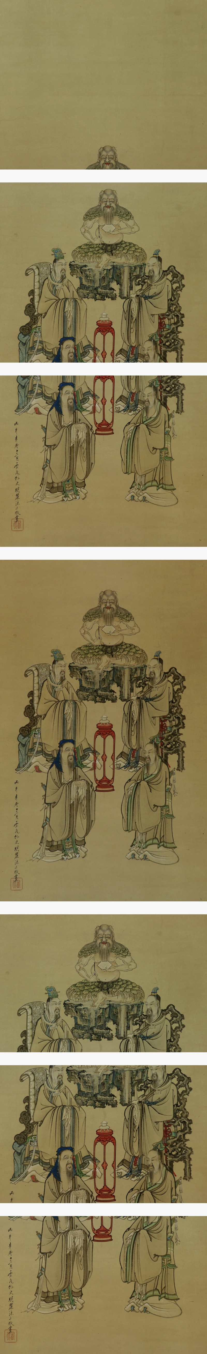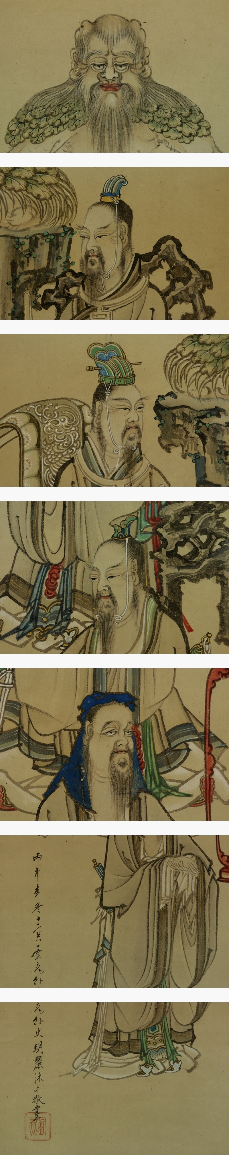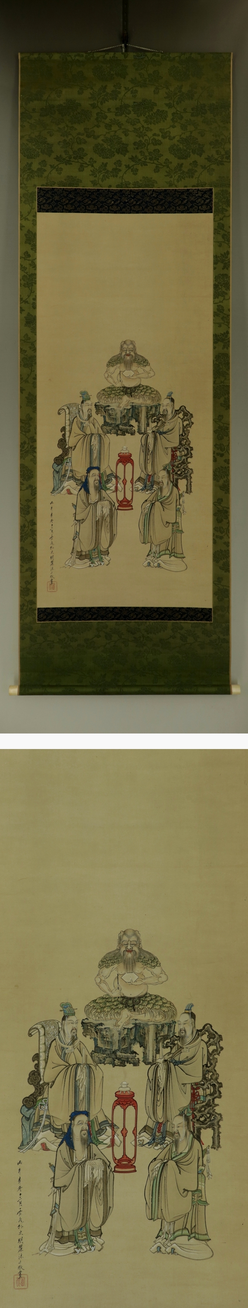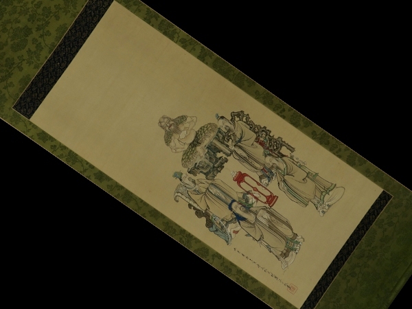 古画【五聖人】 本紙は、染み、汚れ、軽い折れ、軽い皺、虫食い痕、ヤケがあります。 表装は、染み、汚れ、軽い皺、虫食い、破れ、ほつれ、修理痕、 軸先に汚れとヒビがあります。 【サイズ】 作品 横約53.5cm×縦約121cm 表装 横約65cm×縦約197cm |
