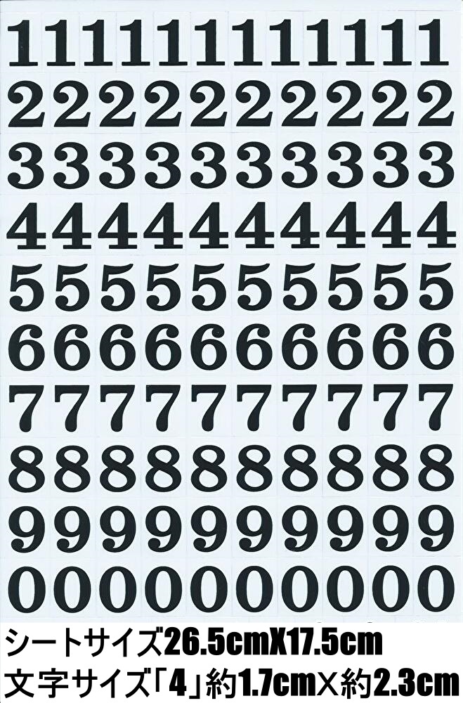 文字のサイズは例として「4」は約1.7cmX約2.3cmです。