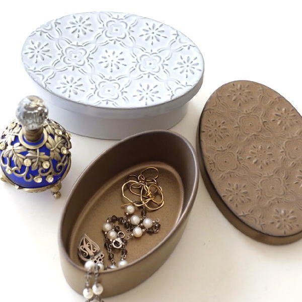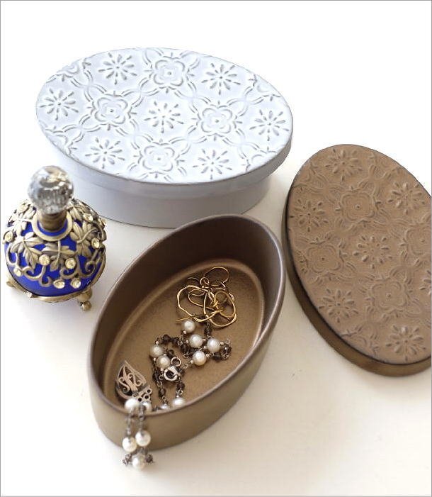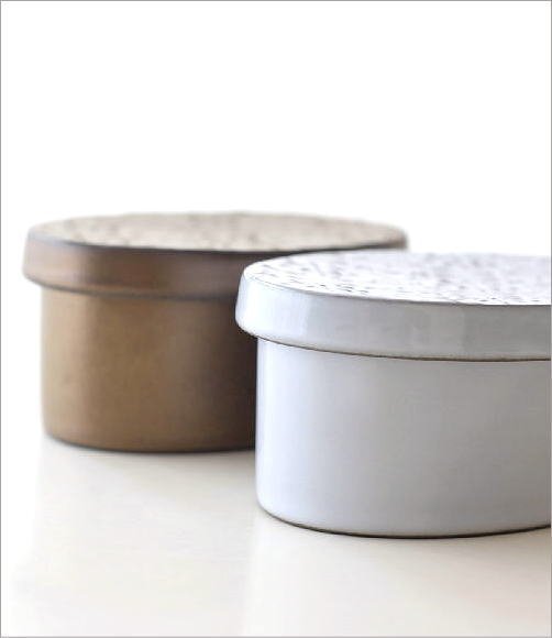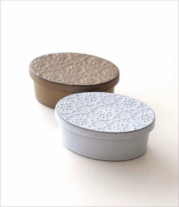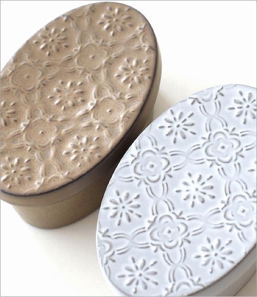 こちらのページでは【Aカラー】のみの販売です 陶器製のちいさな蓋付きボックスは ホワイトとゴールドの2カラー 蓋はお花畑のようなエンボス模様があり オーバルの優しい形で コレクションケースのような雰囲気 アクセサリーや小物ボックスとして オシャレな使い方も出来そうです もちろん食卓で 箸休めの一品を入れたり バターやジャムなどにも。 商品名 : 陶器のミニオーバルBOX 商品番号 : ksn5364 全体のサイズ(cm) : 幅11.5×奥行7.5×高さ4.7 ボックス内サイズ : 幅10×奥行6×深さ3.2 材質 : 陶器 重量 : 270g 生産国 : 日本(瀬戸) ※食器洗浄機内に設置する際は、器同士がぶつかると欠けやすい性質がありますため十分にご注意ください ※器が傷付く恐れがありますので、スタッキングする際はご注意ください ※細かな擦り傷が見られる場合があります ※ディスプレイによる色の違いはご了承下さい |