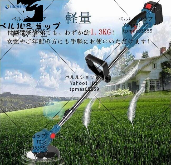 • 【軽量】:枝の剪定、雑草や芝生のお手入れにぴったりの軽量設計(約1.3kg)のコードレス草刈り機です。軽いので腕が疲れる事なく、女性やご高齢の方でも作業が楽に進みます。