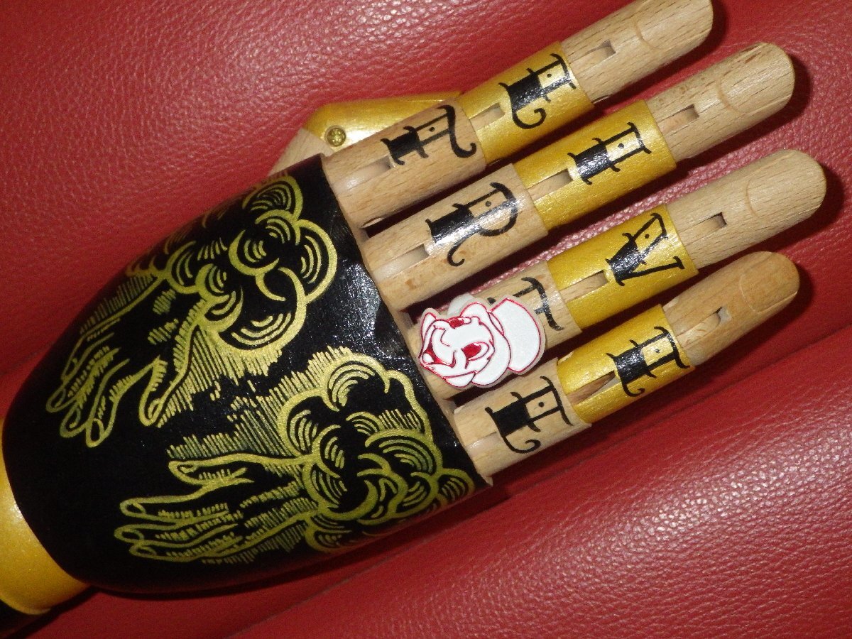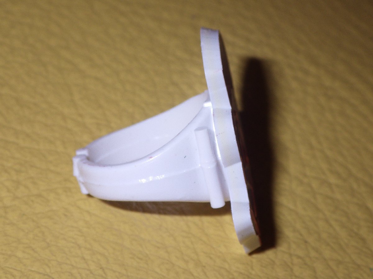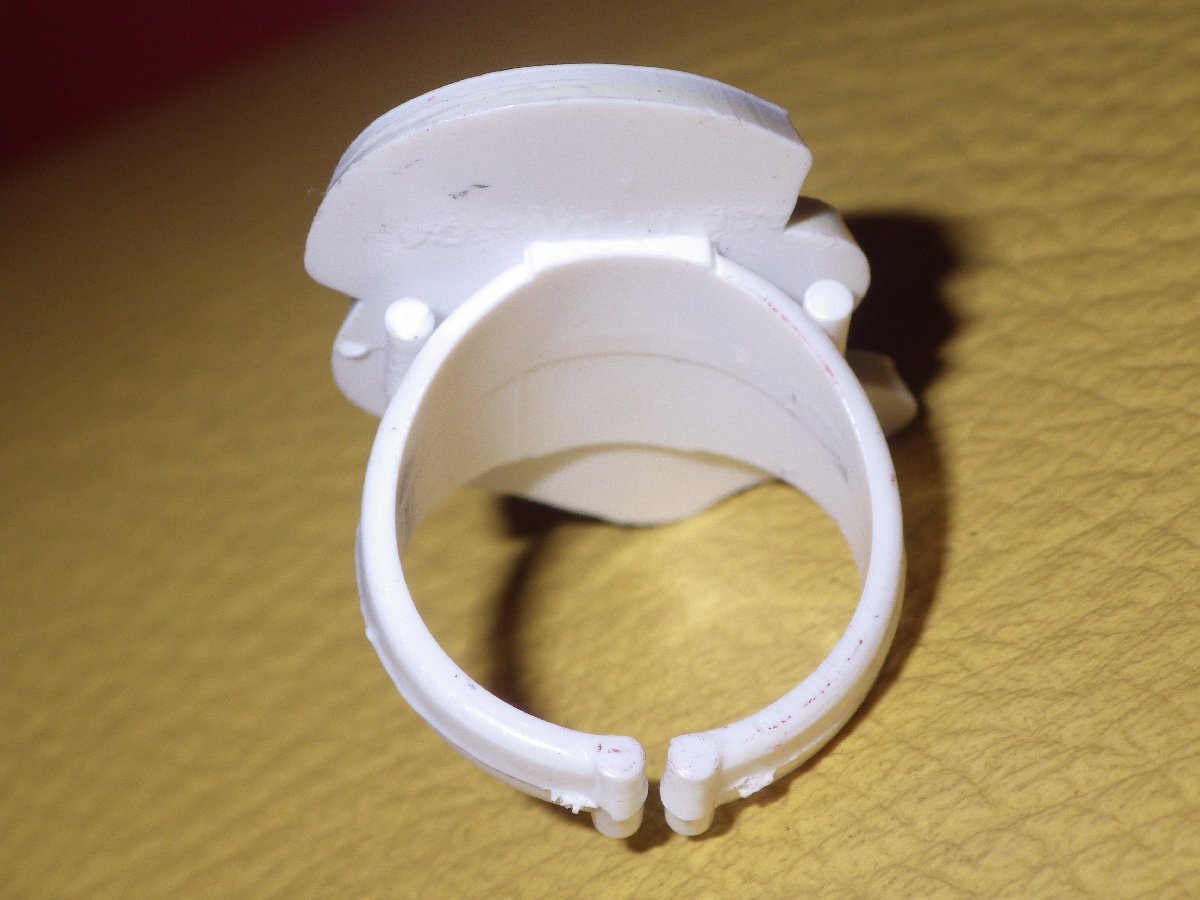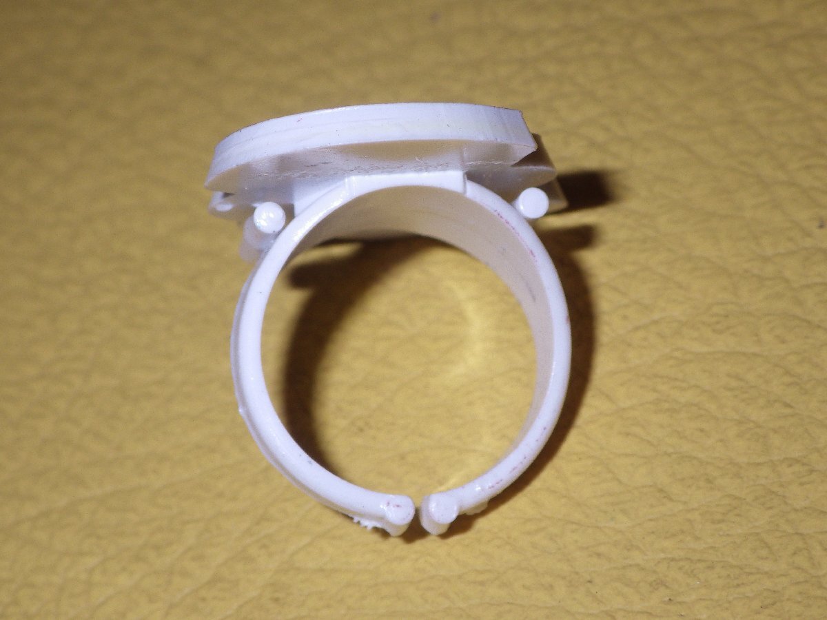 素材はプラスチック、カラーはホワイト×メタリックレッド、サイズは通常時で9号くらい、ある程度サイズが開きますので9号(指まわり49.2mm)から11号(指まわり51.3mm)くらいまでの指に良さそうななサイズになります♪(ピンキーリングにも◎♪)