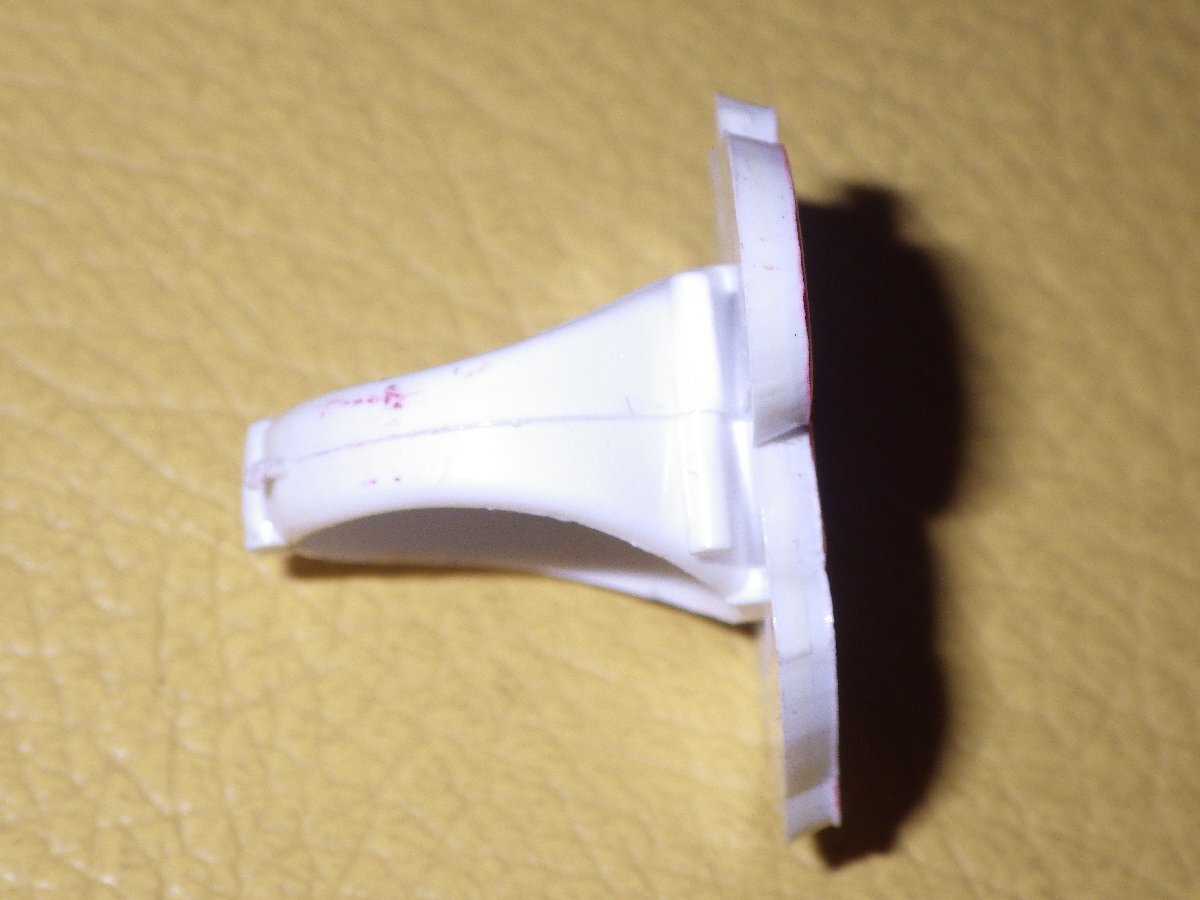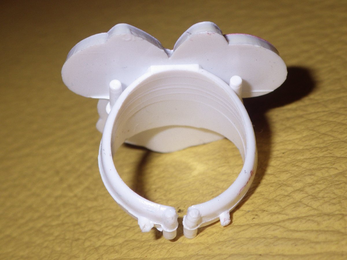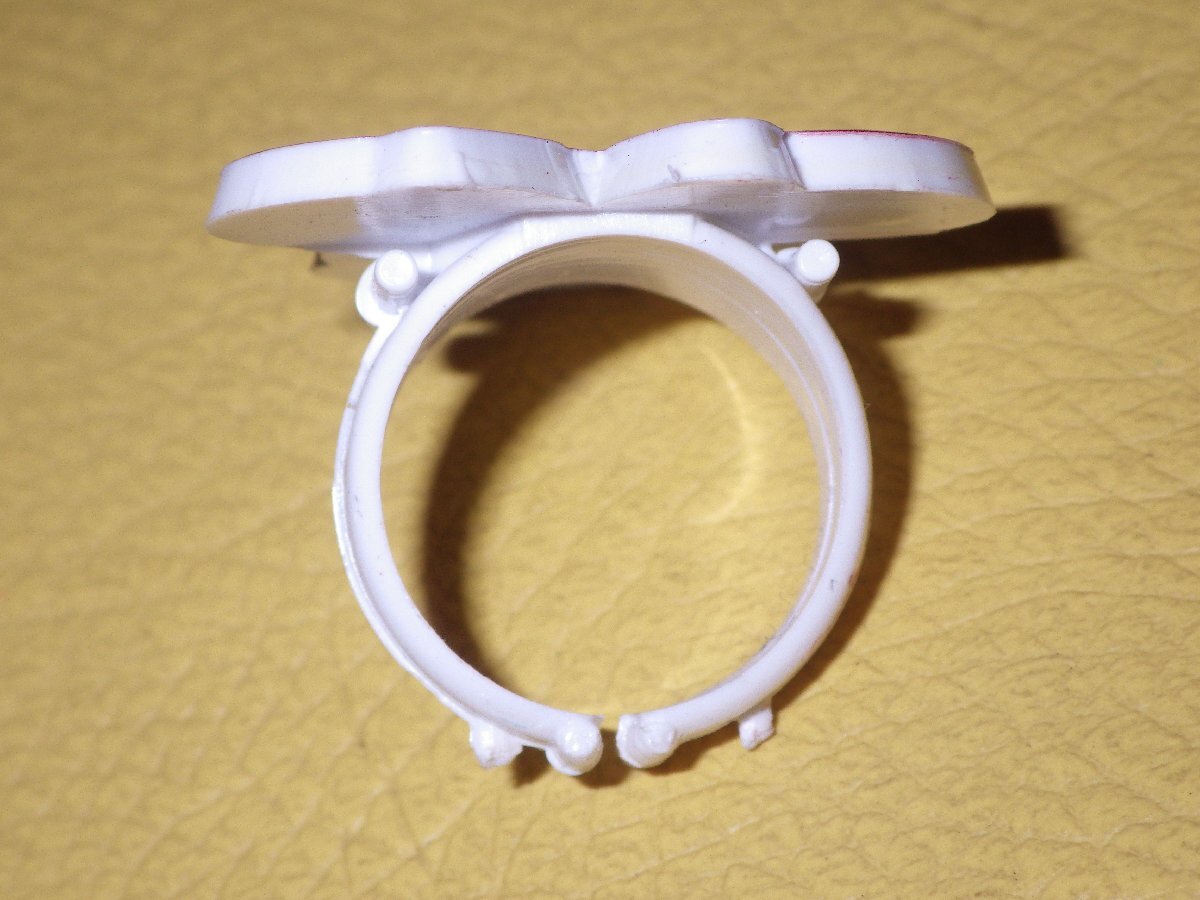 素材はプラスチック、カラーはホワイト×メタリックレッド、サイズは通常時で9号くらい、ある程度サイズが開きますので9号(指まわり49.2mm)から11号(指まわり51.3mm)くらいまでの指に良さそうななサイズになります♪(ピンキーリングにも◎♪)