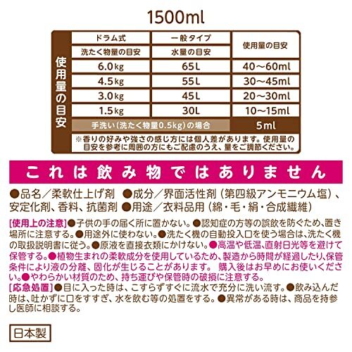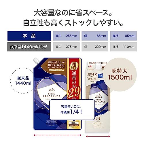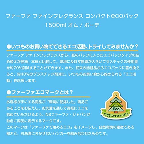 「ファーファ ファインフレグランス オム 1500ml 詰替 柔軟剤 クリスタルムスク の香り 大容量 エコパック」▼4902135326931▼(商品説明)・ 1500ml ×1個 4902135326931・・ScentName:クリスタルムスク の香りSize:1500ml ×1個・素材・製造方法からこだわったプレミアム柔軟剤。清潔感あるクリスタルムスクの香り。・原材料: 界面活性剤(第四級アンモニウム塩)、安定化剤、香料、抗菌剤・商品サイズ (高さ×奥行×幅): 85mm×85mm×255mm・ブラント名: ファーファ・メーカー名: NSファーファ・ジャパン説明 商品紹介 超特大サイズ、エコパック詰替えが登場! ●清潔感あるクリスタルムスクの香り。 ●世界中の高品質素材を厳選。香水にも使われる貴重な天然香料を贅沢に配合。産地や抽出方法にまでこだわって探した深みのある香り。 ●時間の流れごと楽しめる飽きの来ない香り。キャップを開けた瞬間から、服を脱ぐその瞬間まで、時間の経過に合わせてトップ、ミドル、ボトムと、印象そのままに移りゆく、独自のトライアングルレイヤー技術。 ●その時々で最適な強さを添える残り香。干すとき、畳むとき、着ているとき、 香りを感じたいシーンに合わせてふわりと舞う、設計された強度バランス。 ●抗菌※・防臭 ※すべての菌にがあるわけではありません。 ※同じ香りのファブリックミストシエルも販売中です。 日本製 fabric softener made in Japan 柔?? 日本制 原材料・成分 界面活性剤(第四級アンモニウム塩)、安定化剤、香料、抗菌剤 使用方法 【全自動洗濯機の場合】 柔軟仕上げ剤の自動投入口に本品を入れ、洗濯します。 【二槽式・手洗いの場合】 すすぎの水がきれいになったら本品を入れ、3分まわすか、ひたした後、脱水します。 【使用量の目安】 洗濯物量の目安1.5kg/水量の目安30L/使用量の目安10~15ml、 3.0kg/45L/20~30ml、 4.5kg/55L/30~45ml、 6.0kg/65L/40~60ml 手洗いの場合(洗濯物量0.5kgの場合)/5ml ※香りの好みや感じ方には個人差があります。使用料の目安を参考に周囲の方にもご配慮のうえ、お使いください。