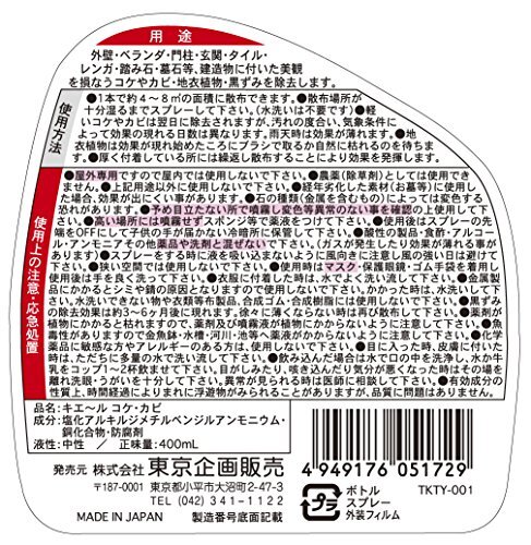 「TO-PLAN(トプラン)キエール・コケカビ400ml」▼4949176051729▼(商品説明)・ 400ミリリットル (x 1) ・内容量:400ml・サイズ:高195*幅90*奥行55(mm)・スプレーするだけでコケ・カビや地位植物、黒ずみを除去・防止する住居用洗剤です。・ブラント名: TO-PLAN(トプラン)・メーカー名: 東京企画販売説明 商品の説明 スプレーするだけでコケ・カビや地位植物、黒ずみを除去・防止する住居用洗剤です。こすらず簡単、効果長持ち。ベランダ・外壁・玄関等が驚くほどキレイに蘇ります。屋外用。 ご注意(免責)>必ずお読みください 在庫完売の際は、お取寄せ又はキャンセルとなる場合がございます。また、配送予定日と弊社商品お届け予定日は異なる場合もございますので予めご了承下さい。商品は予告なくパッケージ変更の場合もあります
