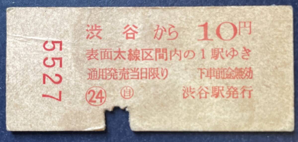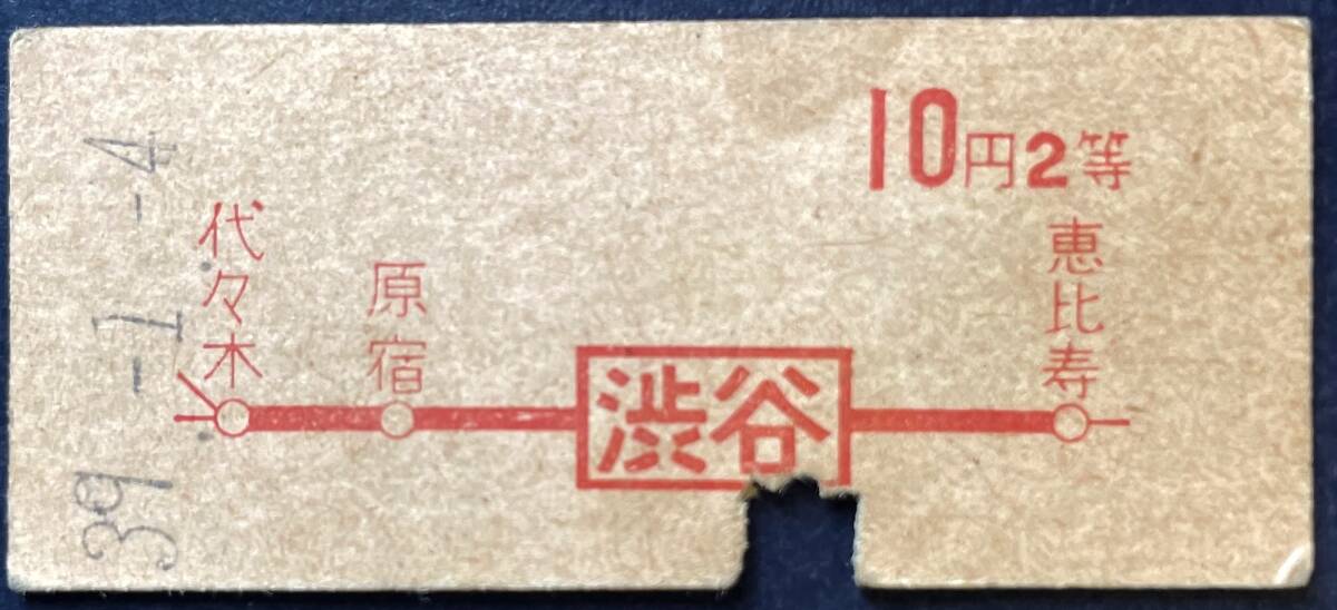 国鉄、硬券、赤い切符、電環渋谷駅10円、乗車券昭和39