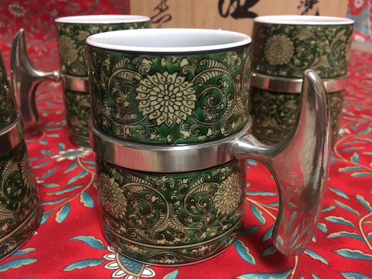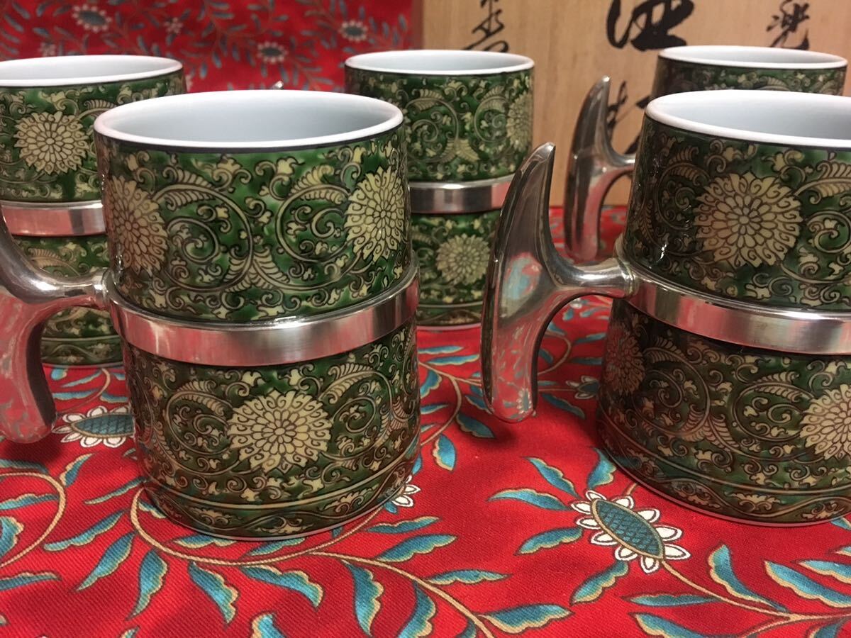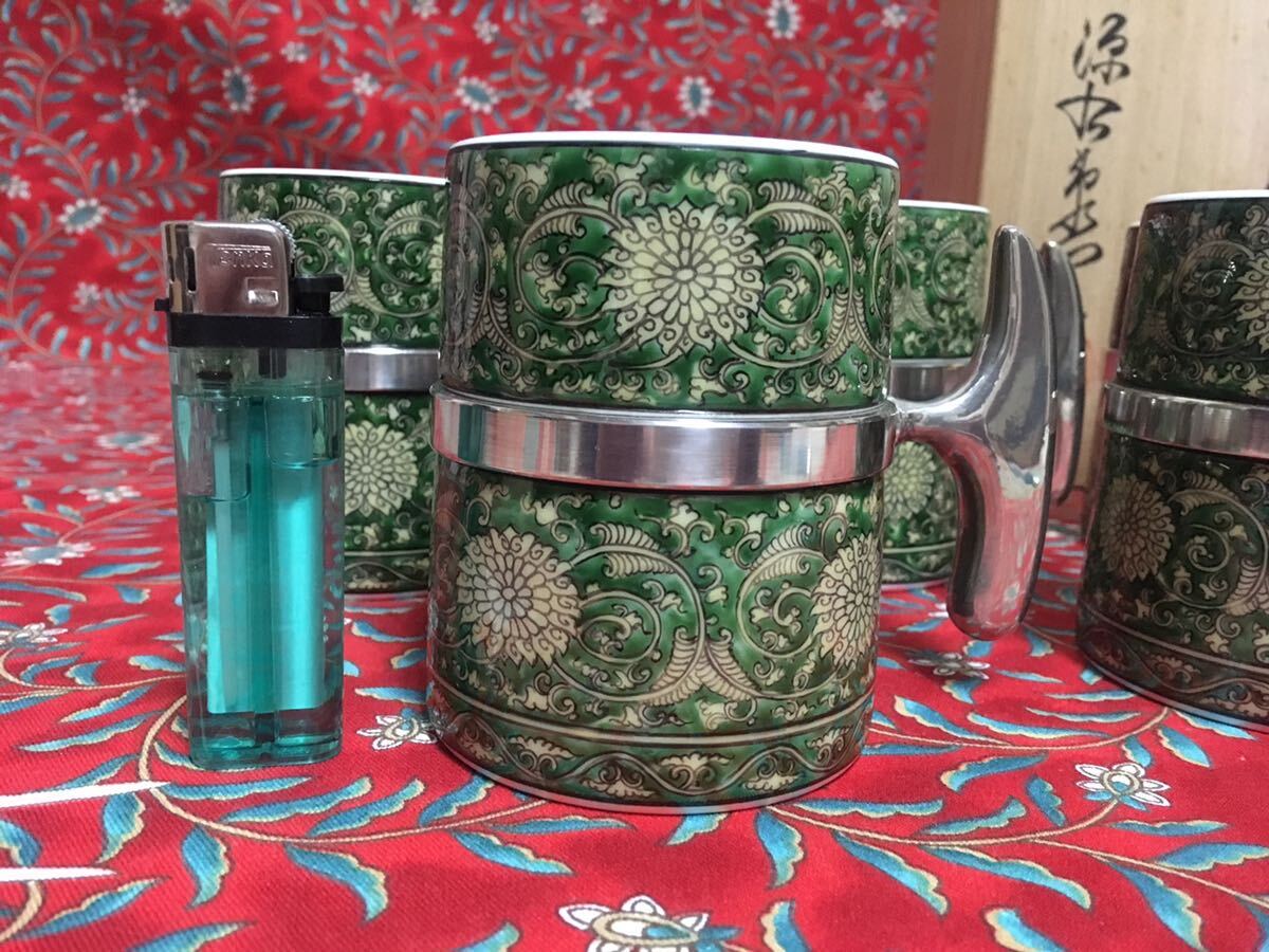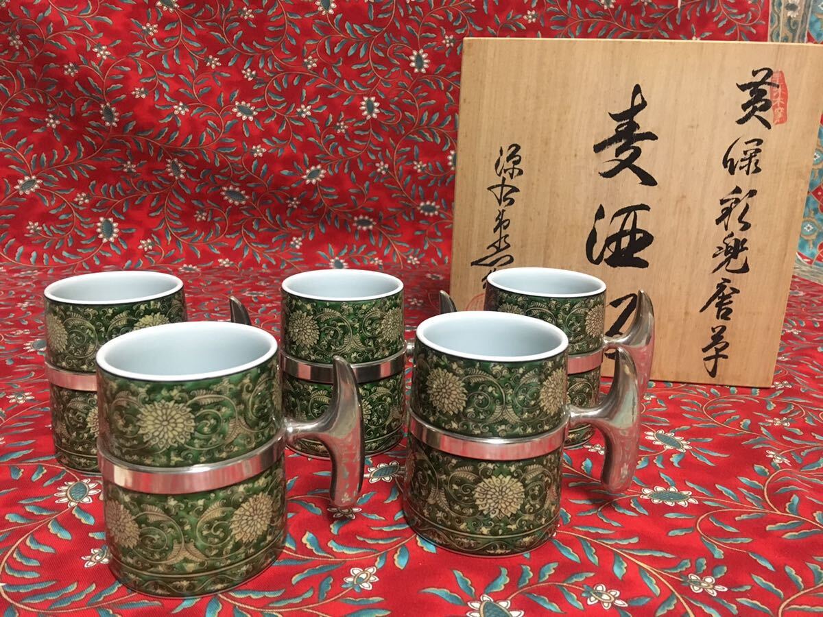 源右衛門の 黄緑彩兜唐草 麦酒杯 5個組 共箱付 保管品です。