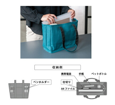 内部には仕切りがあり広いスペースにはA4ファイルがすっきり入ります。仕事に必要な手帳やペットボトルも便利に収納できます。