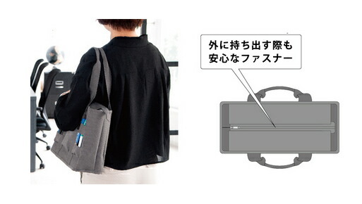 肩にもかけられる、ショルダータイプの持ち手です。さらに上部をファスナーで閉じられるのでテレワークなどで外に持ち出す際にも安心です。