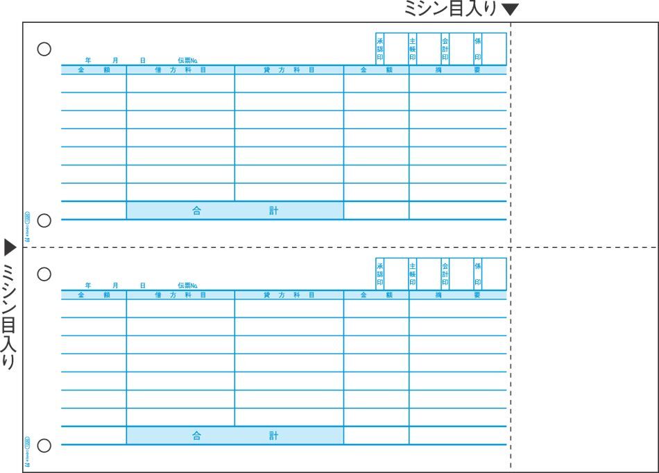 レーザープリンタ用帳票。A4サイズヨコ((仕訳伝票)/(仕訳伝票))。ファイル穴2穴。ファイル穴間隔:80mm。1箱500枚入り。ミシン目切り離し後のサイズ:228x105mm。紙厚:0.08mm坪量;64g/m2。