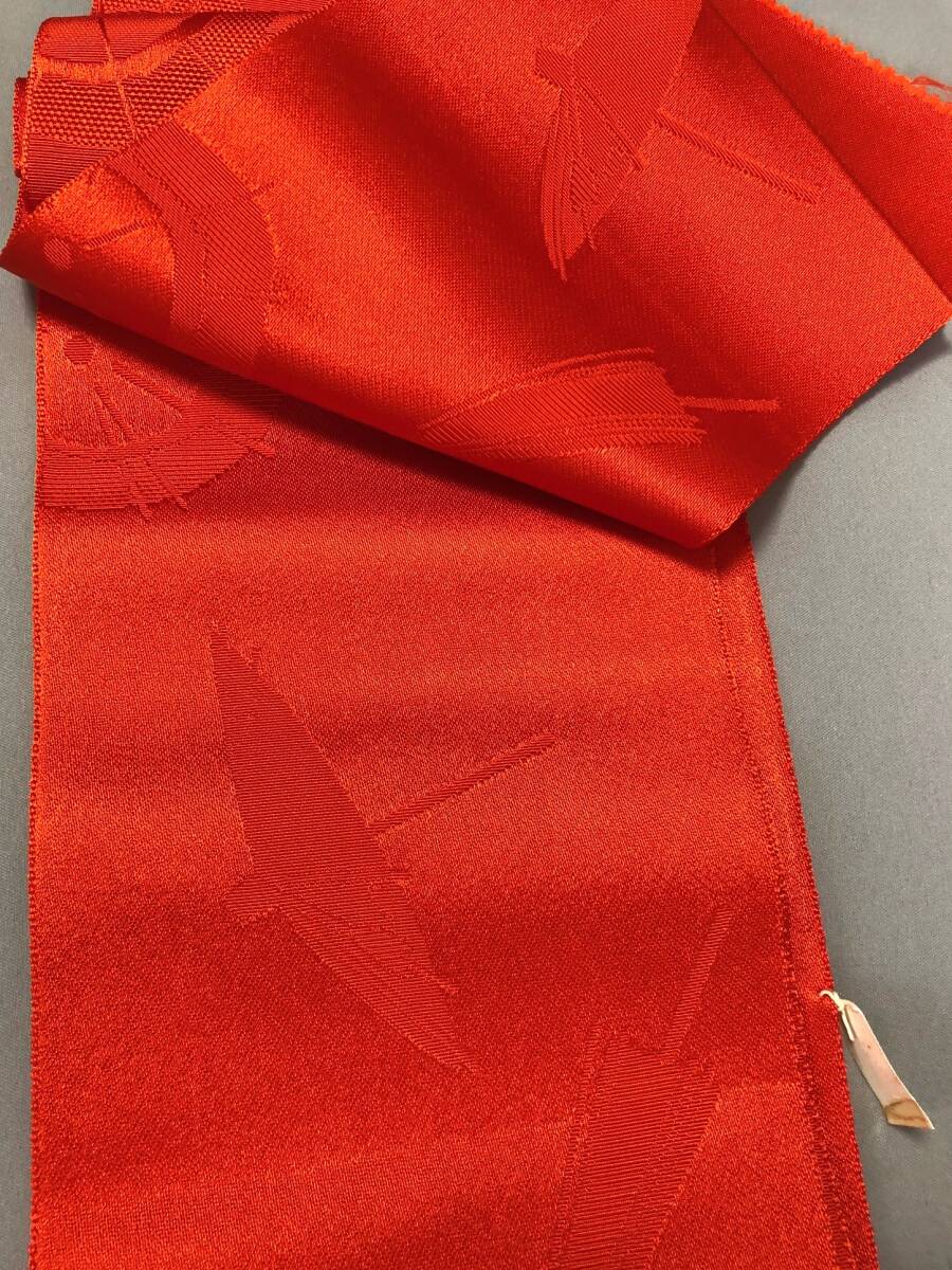 オレンジ色の蛇目傘模様の半幅帯です。長期保管のため、折りじわはありますが、他にダメージは無さそうです。