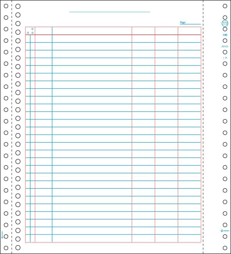 ドットプリンタ帳票。単式。サイズ:10X11"。左右ミシン。ミシン目切り離し後の横サイズ:8_3/10"。ファイル穴:29穴。