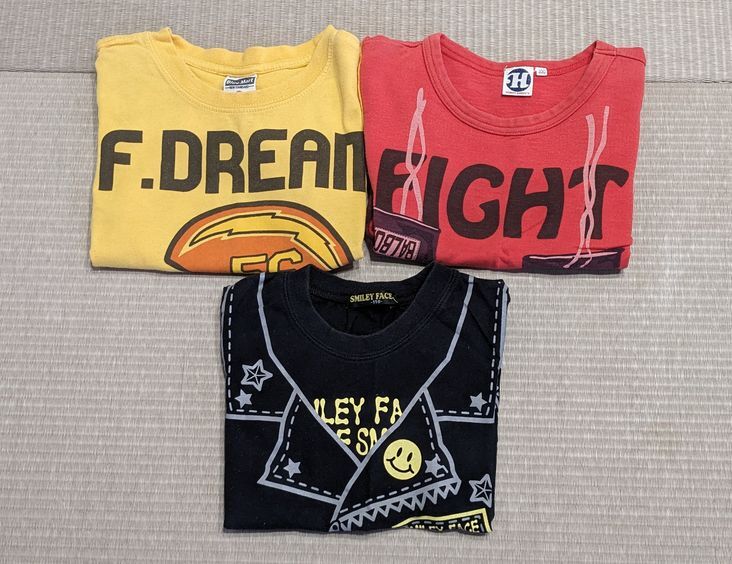 【商品説明】 ・半袖Tシャツ 3点セットのused品です。 ・サイズはオレンジが100サイズ、黒と黄色が110サイズです。 ・子供服は高価な割に使用期間が限られますので、 used品で気にならない方、外遊び用の洗い替えに如何でしょうか? ・子供が使用したものですので、擦れ、ヨレなどそれなりの使用感がございます。 ・現状渡しとなりますので、写真にて状態を確認下さい。 ・新品同様をお求めの方、神経質な方は入札をご遠慮お願いします。 ・配送サイズの関係で、圧縮して発送いたします。 | |