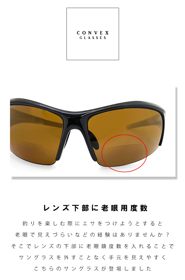 レンズ下部に近用レンズ(+1.50~+2.50)のついたサングラス。 さらに偏光機能である海面の照り返しをなくし眩しさを抑えるハイスペックレンズ。 フィッシングのえさをつける際などにオススメ ゴルフはショットを打つ際に老眼部分が視野に入るためあまりオススメではありません |