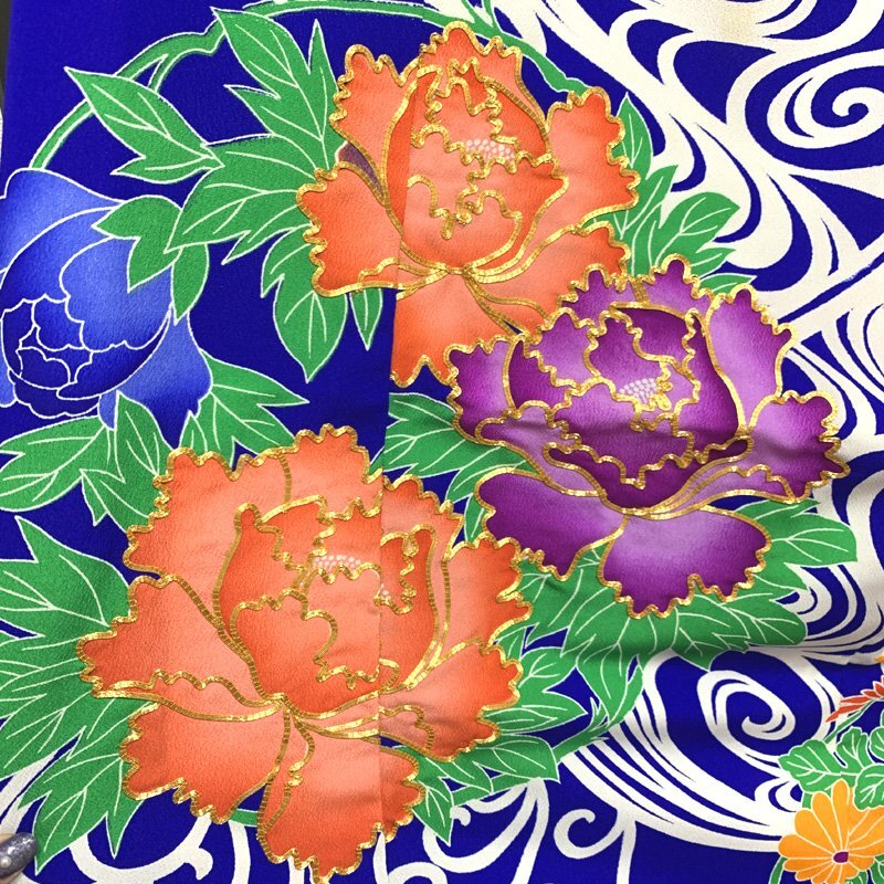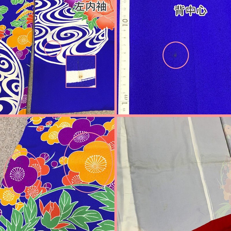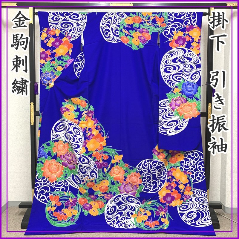 〇掛下 引き振袖 金駒刺繍 牡丹 菊 梅 菖蒲 結婚式 舞台衣装〇 (No.fd) 鮮やかな青色の地に牡丹、菊、梅、菖蒲などの花、流水文が染め出された掛下、引き振袖です。ところどころ金駒刺繍が施されています。比翼付き。 画像のようにところどころシミがございますが、どれも遠目にはわかりません。 【素材】化繊 【色】青 *モニターによって色味は実際と異なる場合がございます。 【サイズ】
