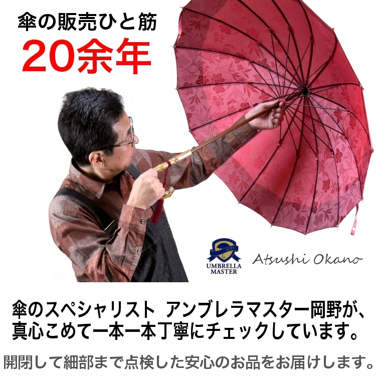 | 富士の湧水が育んだ伝統と技術により生み出された、色良く深く色づき上品で美しい色彩を放つジャガード。 たて糸をキャンパスに、よこ糸を絵筆にみたて季節の花々を大胆に織り描いています。 生地は、防水・撥水加工に加えUVカット加工が施されているので日傘としてもご利用頂けます。 直接触れ合う手元は、馴染みやすさ、さわり心地良さを大切に、傘の花のイメージに合わせたレザー(合皮)を使用。高品質な生地の色や柄にマッチするようにこだわって組み合わせています。 |